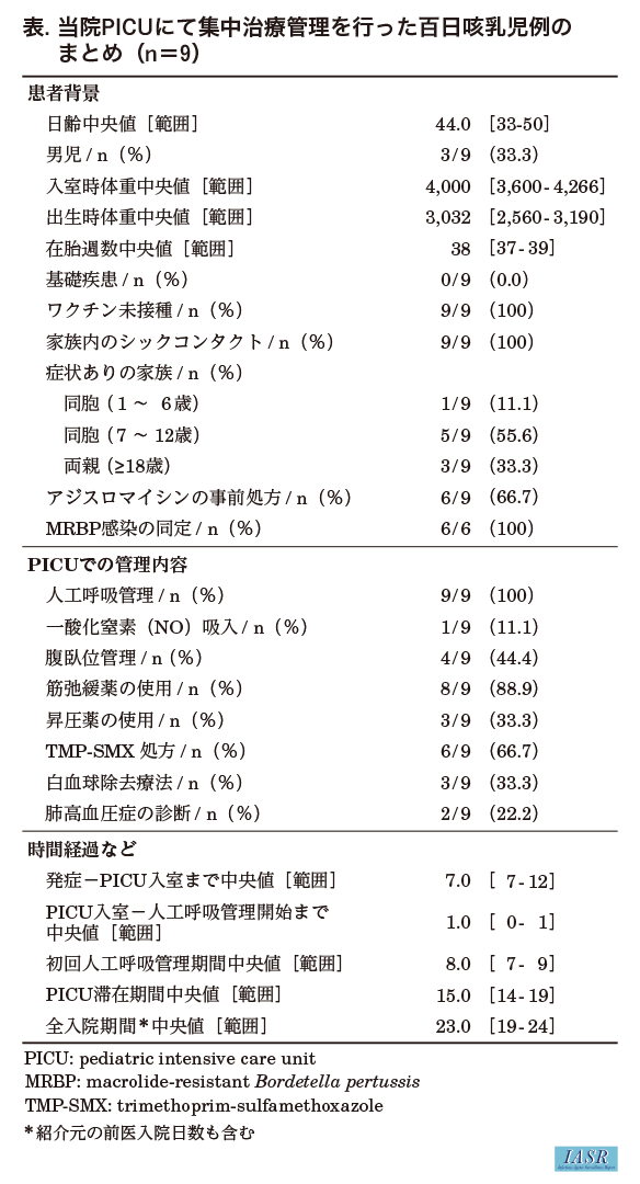 同期間, 12例の百日咳の小児患者が入院し, 11例がPICUで厳重なモニタリングと治療を要し, うち9例は人工呼吸器管理を要した乳児であった(表)。全例, 生後2か月未満, ワクチン接種前であり, 周産期を含めて基礎疾患は認めなかった。また家族への問診から, 全例で家族内のシックコンタクトが確認され, 特に学齢期の同胞に咳嗽などの感冒症状を認めたケースが複数あった。PICU入室から人工呼吸器管理開始までの中央値は1.0日で, 人工呼吸器管理の主な理由は, 頻回の痙攣性咳嗽後のSpO2低下と徐脈であった。人工呼吸器管理中も持続する咳嗽と高い気道抵抗を認めた8例で鎮静薬と鎮痛薬に加えて筋弛緩薬の持続投与が必要であった。白血球数が50,000/μLを超えた症例は3例で, いずれも白血球除去療法を実施した。肺高血圧症を発症した症例は, この3例のうち2例で, 1例は一酸化窒素吸入療法の併用を要した。9例のうち6例に関しては, 百日咳菌感染株の薬剤感受性解析のため, 熊本県保健環境科学研究所を通じて国立健康危機管理研究機構国立感染症研究所(感染研)細菌第二部に患者鼻腔ぬぐい液検体を送付した。臨床検体からの精製DNAを対象としたサンガーシーケンス解析の結果, 5症例の感染株は23S rRNA遺伝子にマクロライド耐性に寄与するA2047G変異を有することが同定された。