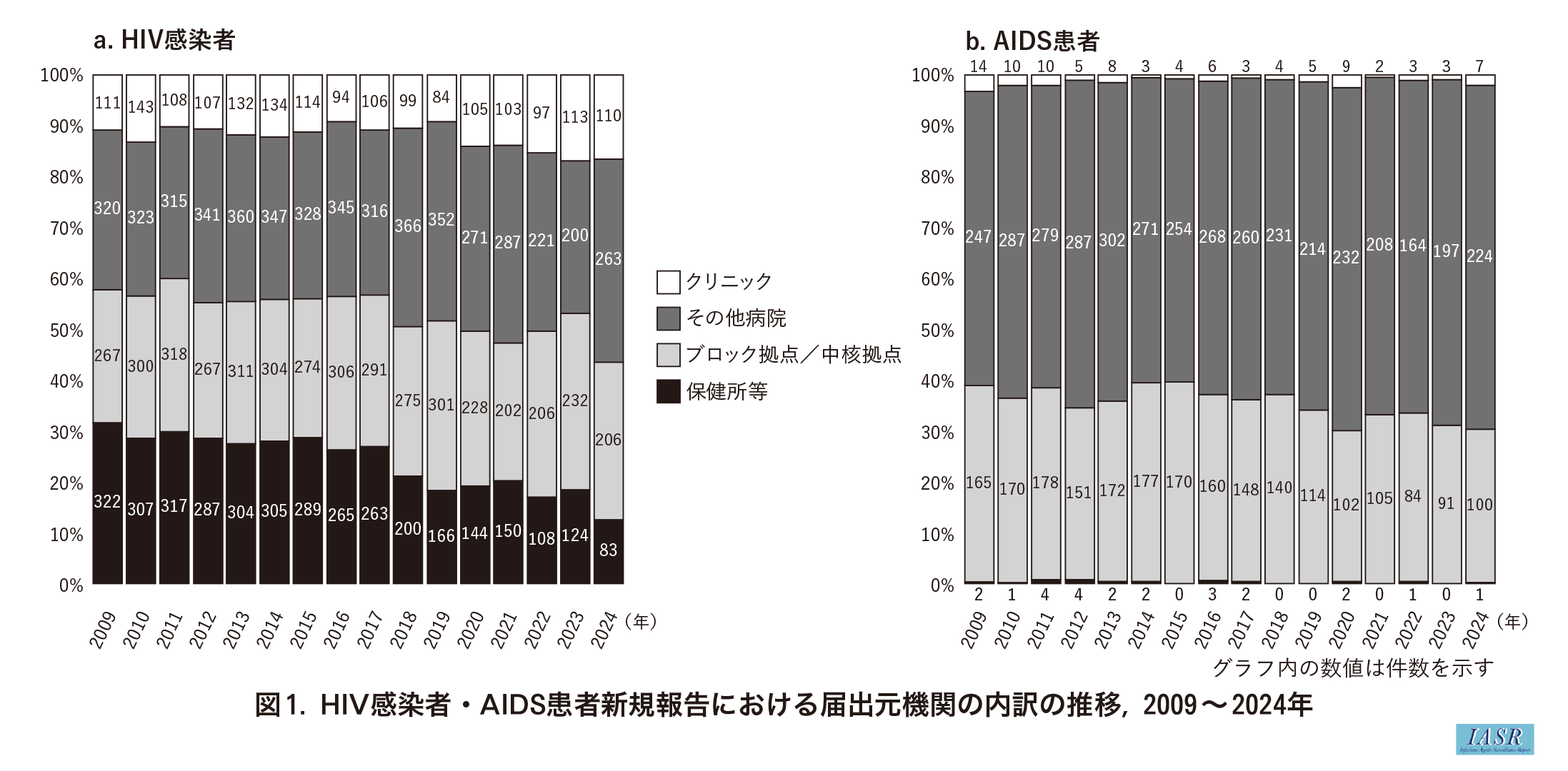 感染症発生動向調査に届出された情報に基づき, 2009~2024年に報告された発生届の届出元機関(届出を行った医師の従事する病院・診療所)について集計した。発生届に記載のあった病院・診療所の名称の表記には揺らぎがあるため, 「従事する病院・診療所の名称」, 「上記病院・診療所の所在地」, 「電話番号」のいずれかが同一のものについてクラスタリングし, 名称の揺らぎや改称のあった病院・診療所について統合した後, 「保健所等」, 「HIV診療におけるブロック拠点病院・中核拠点病院」, 「その他の病院」, 「クリニック」の4種類に分類した。保健所等については, 自治体直営の保健所での検査と, 自治体が委託して実施する検査の主要な委託先について「保健所等」として分類した。HIV診療におけるブロック拠点病院・中核拠点病院(以下, ブロック拠点/中核拠点)については, HIV感染症の医療体制の整備に関する研究の拠点病院診療案内のウェブサイト2)(2024年10月5日現在)に基づいた。過去の届出についても, 2024年10月5日現在の拠点病院の分類に従った。