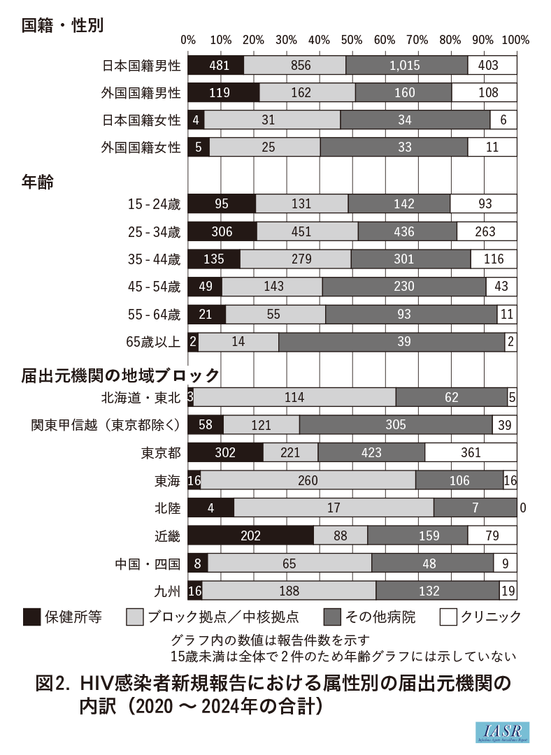 次に, HIV感染者新規報告における属性別の届出元機関の内訳(2020~2024年の合計)を図2に示す。単年の集計とした場合, 属性によっては件数が少なくなるため, 5年間の集計とした。