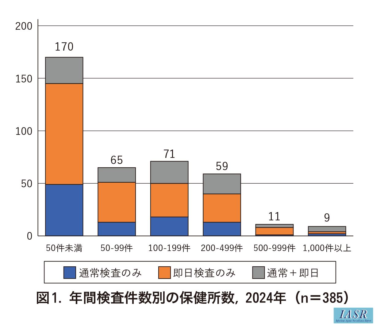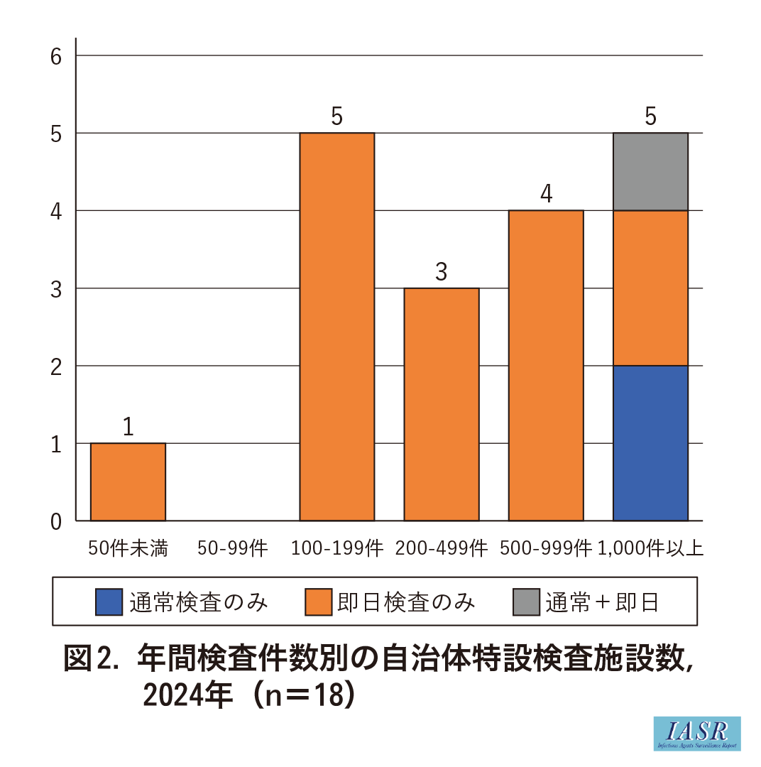 保健所等におけるHIV検査には, 受検者にその日のうちに検査結果を伝える即日検査と, 後日検査結果を伝える通常検査がある。2019~2024年に実施された全国アンケート調査では, 保健所, 特設いずれも5割以上の施設が即日検査のみを実施しており, そのほとんどが予約制での実施であった。通常検査でも, 予約制を取る施設は増加している。予約制は来所人数を把握しやすいという利点はあるが, 無連絡キャンセルや希望時に予約できなかった利用者の検査機会を逃してしまうなどの問題もある。スクリーニング検査が陽性の場合, 確認検査は地方衛生研究所および外部検査機関などの他施設に依頼すると回答した施設が, 即日, 通常検査いずれも75%以上を占めた。保健所の約30%が平日夜間にHIV検査を実施しているが, 土日に実施している保健所は数%にとどまった。特設では, 土日の検査を実施している施設が70%以上と, 週末の検査機会が多く確保されていた。HIV検査の件数は施設間で差が大きく(図1, 図2), 年間検査件数50件未満の保健所が半数を占めている一方で, 特設の検査件数が多い傾向がみられた。検査件数が少ない分, 陽性者への対応経験のある担当者も相対的に少なくなる。アンケート調査では, 対応経験の少なさへの不安も挙げられた。流行が続いている梅毒の検査は90%以上の保健所で実施されている。