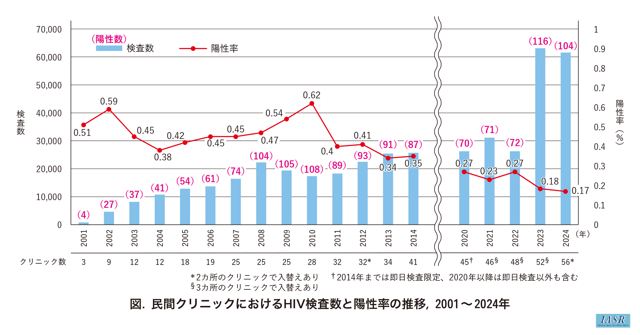 さらに, 本調査は2001年に開始され, 20年以上にわたり民間クリニックにおけるHIV検査状況を一貫して記録してきた(図)。参加施設数と検査件数は年々増加し, わが国における民間クリニックでのHIV検査体制の発展を裏付ける疫学的基盤を形成している。しかし, HIV検査研究班は2024年度で終了し, 長期的な観察体制の継続は不透明である。本稿の公表が, 今後の体制検討の契機となることが期待される。