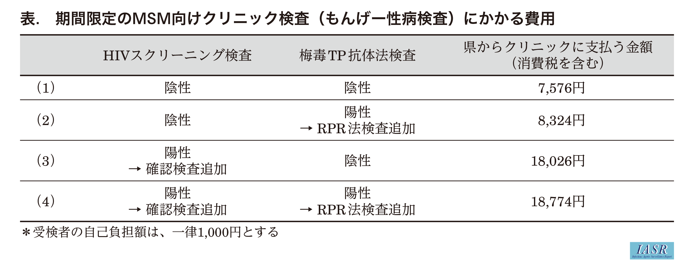毎年度, 夏期(8~9月)および冬期(1~2月)に検査期間を設け, 協力クリニックにおいてキャンペーン冊子・フライヤー・携帯用検査カード画面などを提示した希望者を対象に, 1,000円の自己負担でHIV抗原抗体スクリーニング検査および梅毒TP抗体法検査を実施した。CBOと連携しMSMへの検査啓発を行ったうえで, 予約は不要とし, 本名記載も任意とした。HIVスクリーニング陽性例は確認検査へ, 梅毒TP抗体陽性例はRPR法検査へ進める体制を構築し, 各クリニックの自費診療分については結果に応じて県が規定額(表)を支払う方式とした。陽性告知が必要となる場合を考慮し, 迅速検査は行わず, 結果は1週間後の再診時に伝えることとした。HIV陽性例は県派遣カウンセラーが対応し拠点病院へ紹介, 梅毒陽性例は原則として当該クリニックで保険診療による治療を開始した。