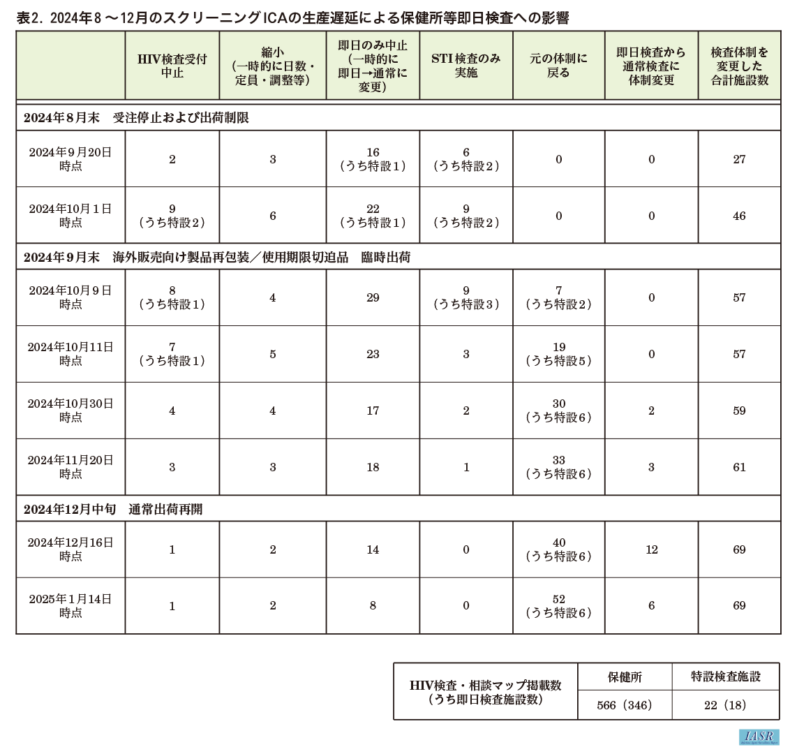 2024年8月下旬~12月中旬にスクリーニングICAの生産遅延による出荷制限が生じ, 一部の即日検査実施施設ではHIV検査の中止, または検査体制の変更などの対応が行われた。HIV検査・相談施設を横断的に検索できるwebサイト「HIV検査・相談マップ(https://www.hivkensa.com/)」に掲載中の保健所等即日検査施設364カ所のうち69カ所(19%)において, HIV検査受付中止, 即日検査のみ中止, 即日検査を通常検査に変更, 性感染症検査のみ実施, など様々な対応が取られた(表2)。当webサイト上では検査希望者に向けて, 検査体制が変更されている場合があることについて注意喚起を行った。また, 2025年4月には, 確認ICAの製造遅延による欠品が生じ, 一部の民間臨床検査センターでは一時的に抗体確認検査受託が停止された。民間臨床検査センターでは, 確認ICAを用いた抗体確認検査が年間約8,000件実施されている6)。国内に流通している抗体確認検査試薬は本製品のみであり, HIV-1とHIV-2の抗体を鑑別できる診断薬についても本製品のみである。そのため, 一部で供給再開まで抗体確認検査を待つなどの対応が求められた。スクリーニングICA, 確認ICAのいずれも国内に代替品がないことから, 不安定な試薬供給となるとHIV検査体制に影響が生じること, 供給不安における代替手段としても各地域における検査機会の多様化は重要であること, が再認識された。