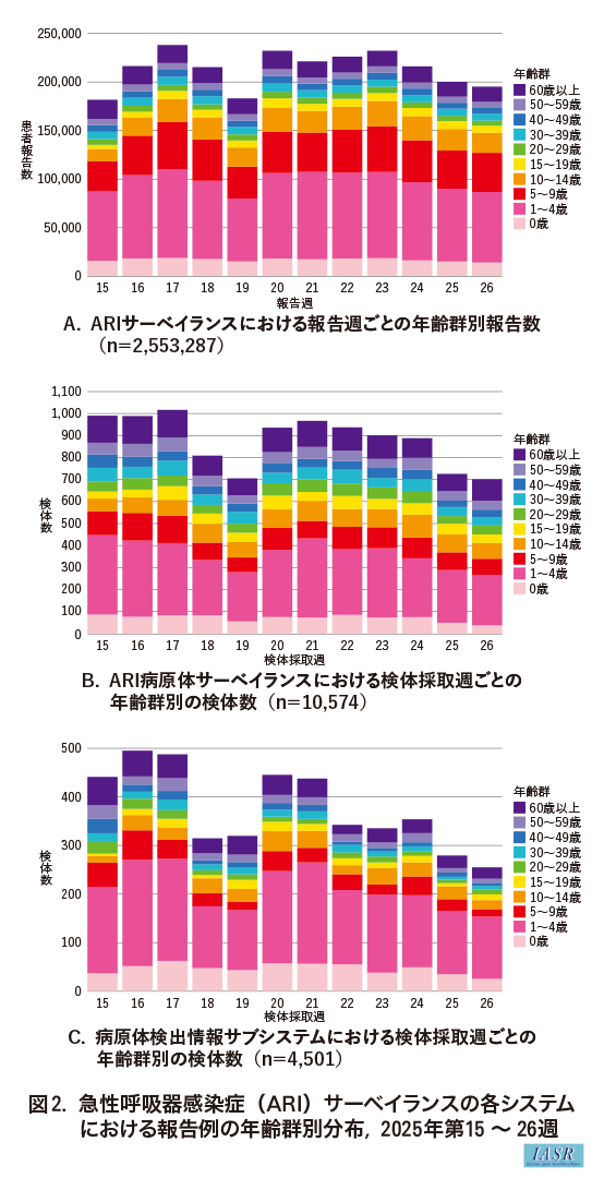 急性呼吸器感染症サーベイランスの各システムにおける報告例の年齢群別分布の検討、2025年第15~26週
