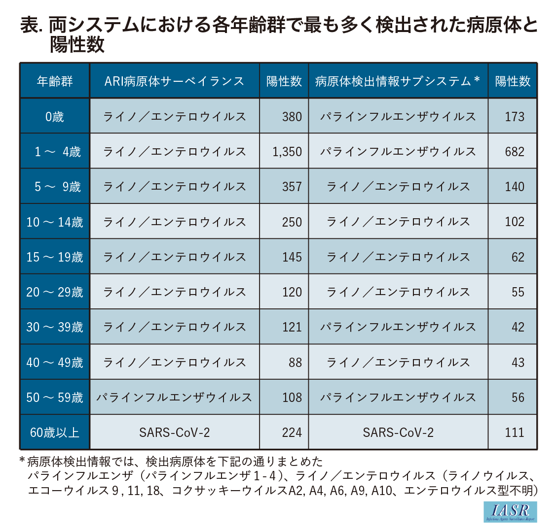 「ARIサーベイランス」および「ARI病原体サーベイランス」の報告における10歳未満の割合はそれぞれ65.4%と52.2%であった。ARI定点が, 小児科に多く設定されていることが, 10歳未満が相対的に多い理由として考えられる。2つのサーベイランスの報告に差があったのは, 検体のとりやすさ, あるいは年齢を考慮した割り付けを医療機関で行ったことが考えられる。一方で, 「ARI病原体サーベイランス」では15~59歳の割合は27.0%を占めており, 「病原体検出情報サブシステム」での同年齢群の割合は17.9%であった。この差の理由として, 「ARI病原体サーベイランス」では陰性も報告していることが考えられる。60歳未満の年齢群では, ライノ/エンテロウイルスないしパラインフルエンザウイルスが最も多かったが, 60歳以上の年齢群では, SARS-CoV-2が最も多く報告された。
