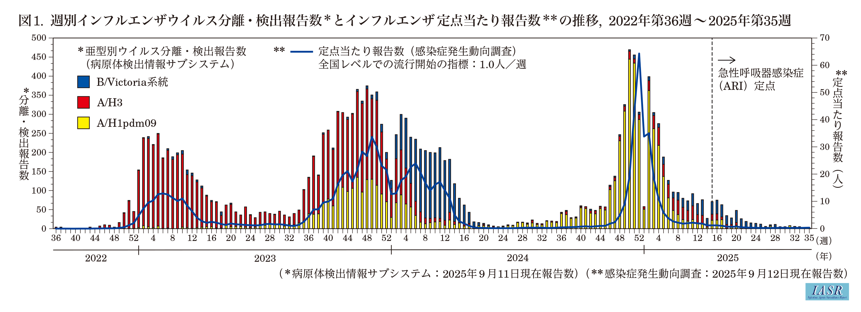 2024/25シーズン患者発生状況(2025年9月12日現在):感染症発生動向調査では, 全国約5,000のインフルエンザ定点医療機関(小児科約3,000, 内科約2,000)から毎週インフルエンザ患者数が報告されていた(届出基準はhttps://www.mhlw.go.jp/bunya/kenkou/kekkaku-kansenshou11/01-05-28.html)。なお2025年第15週以降は, 全国約3,000の急性呼吸器感染症(ARI)定点(小児科約2,000, 内科約1,000)からの報告に変更されており, データの解釈には注意が必要である。