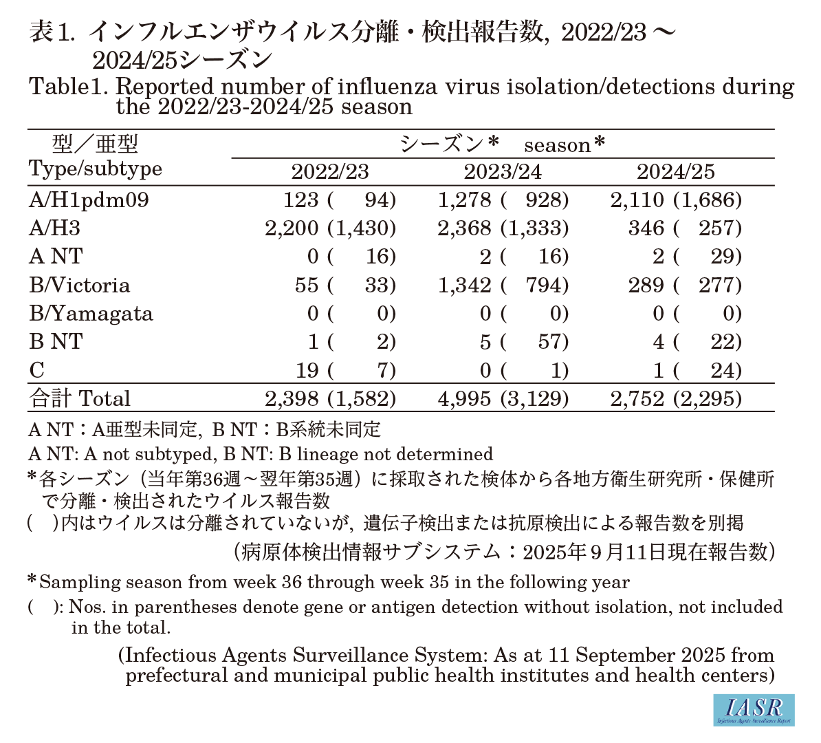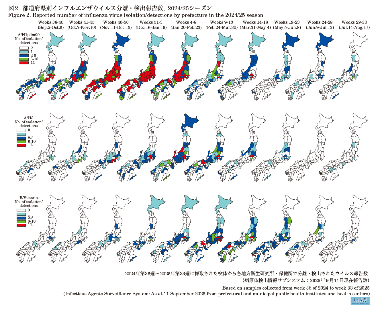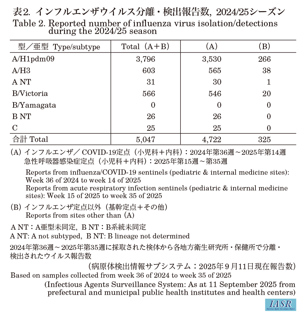 2024/25シーズンウイルス分離・検出状況(2025年9月11日現在):全国の地方衛生研究所・保健所が分離・検出し, インフルエンザ病原体サーベイランスに報告したインフルエンザウイルスは5,047(分離2,752, 検出のみ2,295)(表1), うちインフルエンザ定点で採取された検体からの分離・検出報告数は4,722, 定点以外の検体からの分離・検出報告数は325であった(表2)。型・亜型別ではA/H1pdm09亜型が3,796株, A/H3亜型が603株(亜型未同定は31株)で, B/Victoria系統が566株, B/山形系統の報告はなかった(系統未同定は26株)。2024/25シーズンはA/H1pdm09亜型が大きく流行したが, 2025年に入ってからA/H3亜型とB/Victoria系統の報告数が増えた(図1および図2)。