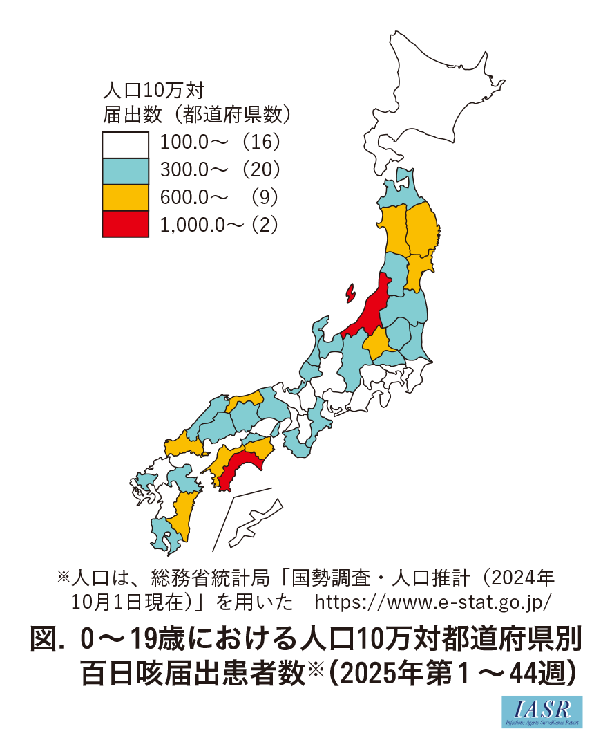 また, 百日咳届出患者(0~19歳)の都道府県別人口10万人当たりの届出数は, 高知県(1,112.6例), 新潟県(1,040.5例), 山口県(821.0例), 群馬県(813.8例)の順に多く, 届出状況には地域差が認められた(図)。なお, 重症例や死亡例に関する疫学情報のまとめも寄せられている3,4)。