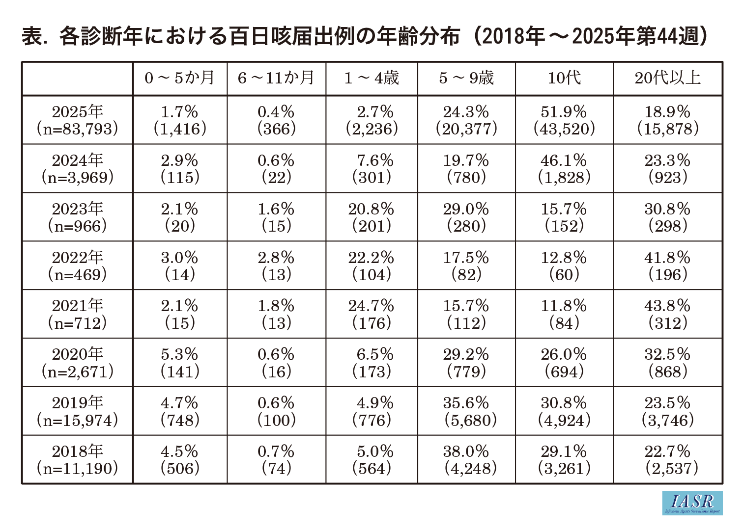 2025年第1~44週までに届出のあった83,793例について, 性別は男性41,857例(50%), 女性41,915例(50%)であった(不明21例を除く)。年齢中央値は12(四分位範囲9~16)歳で, 10~19歳が43,529例(52%)で最も多く, 次いで5~9歳が20,377例(24%)であり, 前年までと比して大きく増加した(表)。重症化が懸念される乳児の届出数は2025年に著しい増加を示し, 0~5か月児では2019年と比較して1.9倍, 6~11か月児では3.7倍に増加した。なお, 届出時点の情報として, 発生動向調査上で確認された死亡例4例のうち2例が6か月未満児であった。感染経路が把握された13,222例のうち, 同胞(兄弟姉妹)との接触による感染が9,788例(74%)と最も多く, 次いで母親1,604例(12%), 父親1,235例(9%)と, 家庭内感染が大部分を占めた(感染経路の重複あり)。なお, 検査診断方法は2018年時点では分離・同定が123例(1%), 遺伝子検出(PCR法/LAMP法/その他)が5,483例(49%), 単一血清抗体価高値が5,035例(45%), 臨床決定は223例(2%)であった。2025年では分離・同定が971例(1%), 遺伝子検出(PCR法/LAMP法/その他)が51,509例(61%), 単一血清抗体価高値が16,489例(20%), 臨床決定は2,355例(3%)であり, 新たな診断方法として2021年に加わったイムノクロマト法による抗原検出2)は12,039例(14%)であった。
