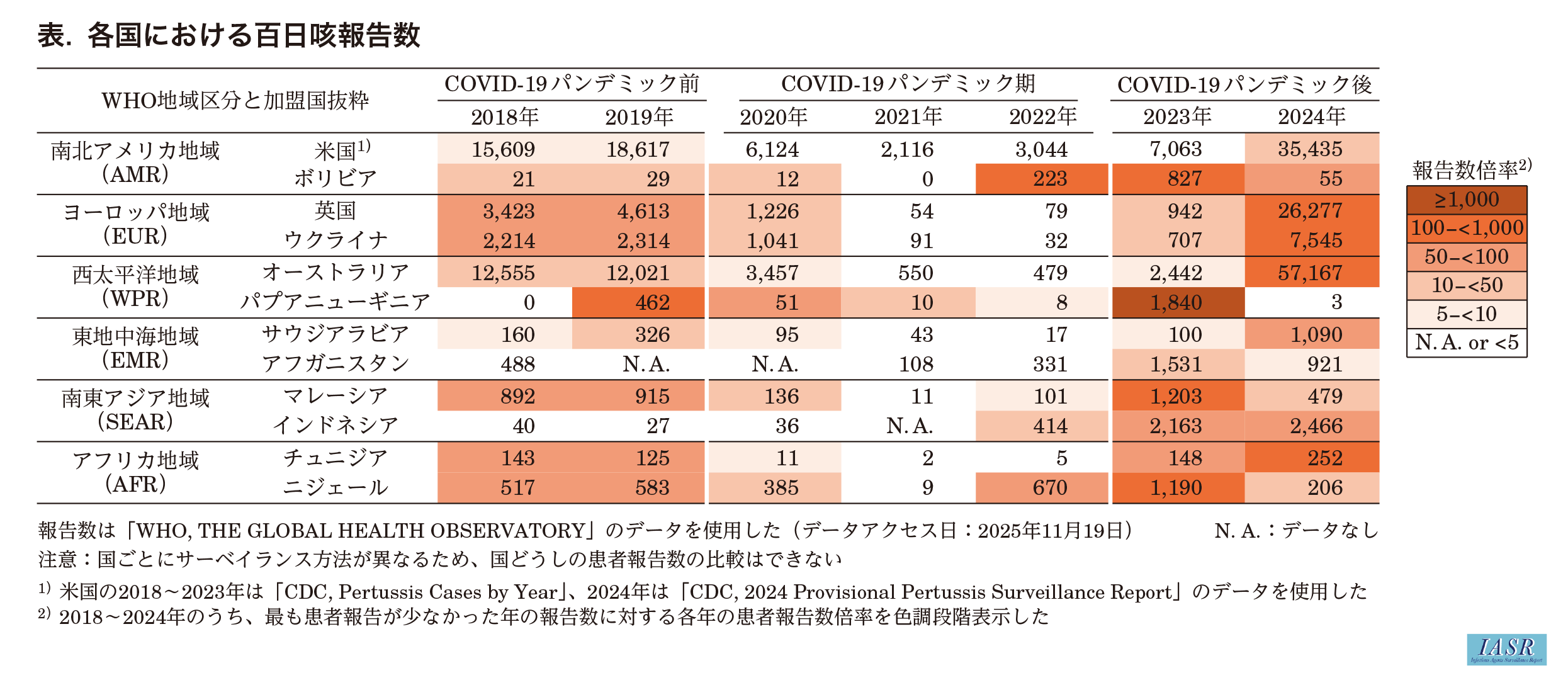 ヨーロッパ地域(EUR):英国とウクライナにおいても, 米国と同様にCOVID-19パンデミック期に減少していた百日咳報告数がCOVID-19パンデミック後の2023~2024年にかけて急増した。2024年の報告数は英国が26,277件, ウクライナが7,545件であった。