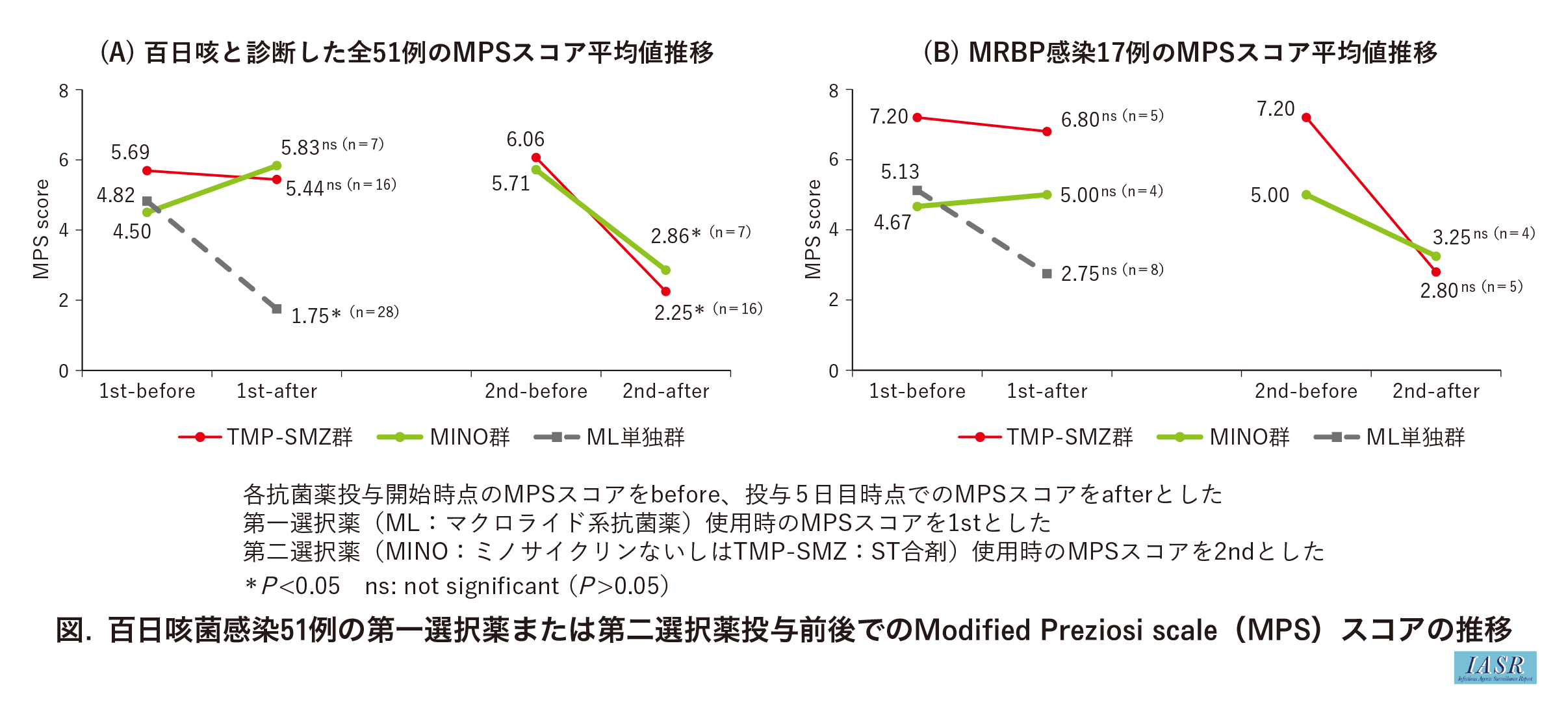 病原体検査に基づく治療を目指したが, 百日咳菌の培養には相当な時間を要するため, 薬剤感受性試験に基づく耐性評価は容易ではない。また, 病院検査室では耐性遺伝子変異の迅速同定も実施が困難である。そこで, 抗菌薬を切り替えるための指標として小児百日咳の臨床症状に基づく重症度評価であるModified Preziosi Scale(MPS, 7点以上が重症)10,11)を用いた治療効果の評価を試みた(図, 補足表)。百日咳菌感染の全51例のMPS推移をみると, 初診時にMPS 4.5以上の評価であった症例が, 抗菌薬投与5日目にMPS 3.0未満に低下していることが有効性の目安となりそうであった(図A)。MRBP感染17例のうち9例では, マクロライド系抗菌薬を5日間投与してもMPSはほとんど変動しなかったが, ST合剤もしくはMINOへの切り替えによりMPSが低下していた(図B)。MRBP分離株の薬剤感受性試験でもMINOへの感受性が確認されており, 薬疹の出現などによりST合剤が使用できない場合には, 8歳以上であればMINO選択の可能性もあり得ると考えられた。一方, MRBP感染症に対する治療であっても, およそ半数(8例/17例)はマクロライド系抗菌薬使用により症状の軽快が可能であった。この現象はマクロライド耐性肺炎マイコプラズマの治療でも同様のことが報告されており, マクロライド系抗菌薬の持つ抗炎症作用や免疫調節作用が影響したのかもしれない12)。百日咳治療に際しては, まずはマクロライド系抗菌薬投与から開始し, MRBPの同定または臨床的不応の所見から, 機を逃さずに適切なタイミングでST合剤への変更をためらわないことが重要であると考えられた。