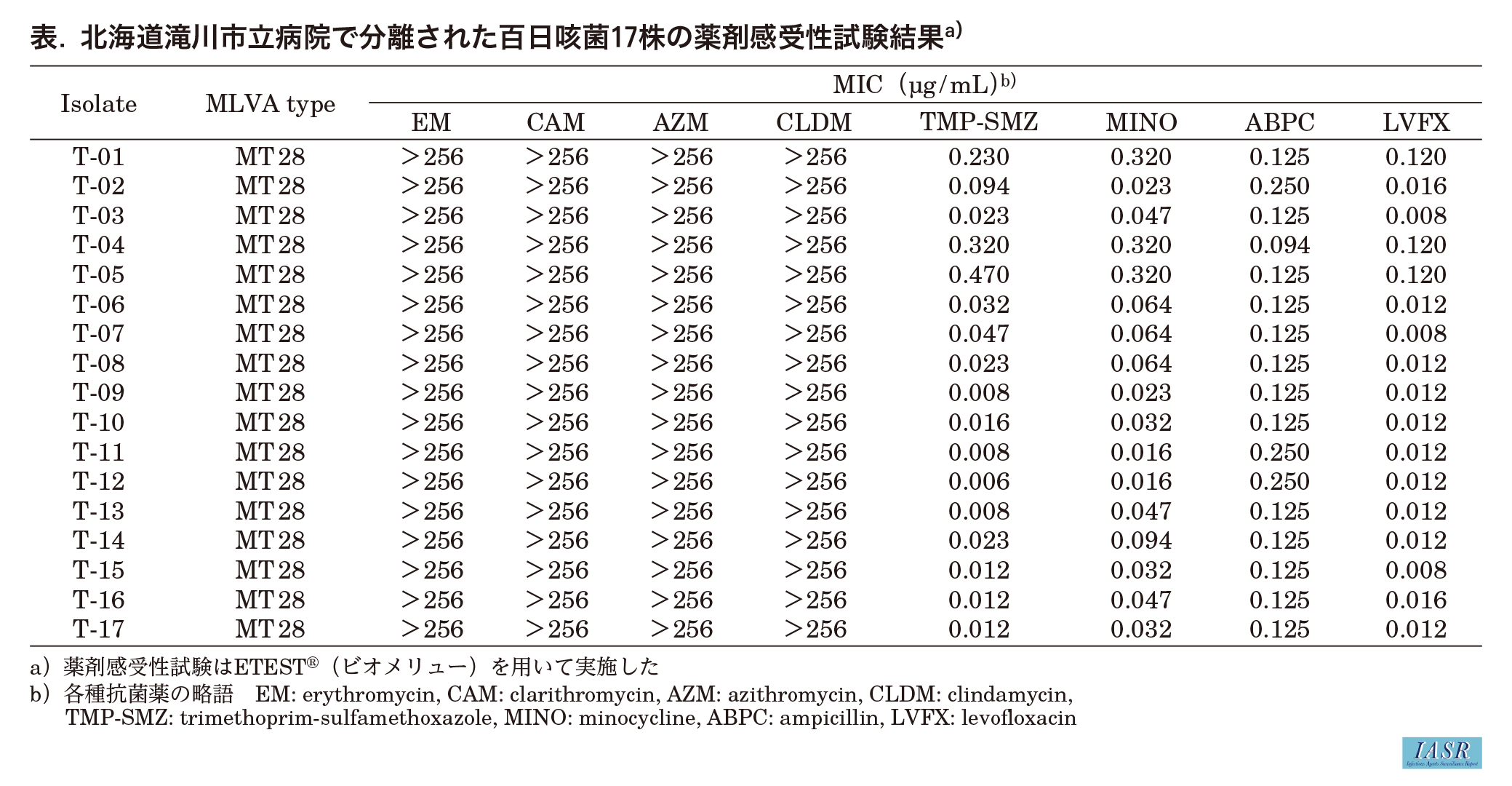 百日咳菌17株は23S rRNA遺伝子のシーケンス解析, 反復配列多型解析(multilocus variable-number tandem-repeat analysis: MLVA)遺伝子型別およびETEST®によるマクロライド系抗菌薬への薬剤感受性試験の結果, いずれもMLVAタイプ(MT)28-MRBPと判断された(表)。