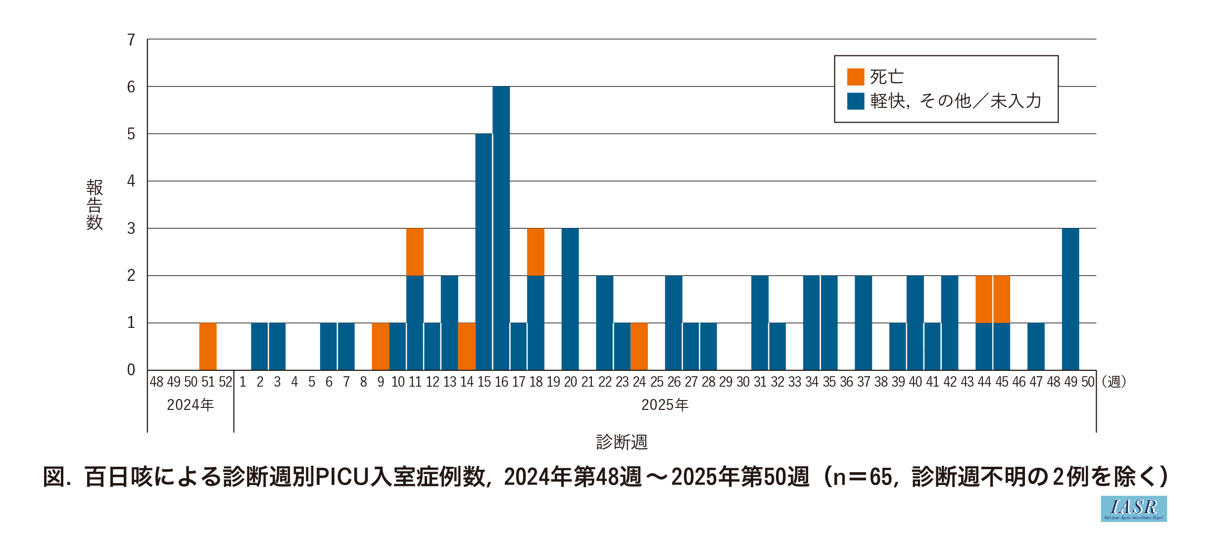 対象期間中に, 全国から65例の症例情報が改良型CRISISに登録された。医療機関の所在地域別では, 北海道6例, 東北1例, 関東甲信越8例, 東海北陸9例, 関西11例, 中国四国3例, 九州・沖縄27例となり, 九州・沖縄が最多, 次いで関西であった。診断週別では, 第16週(2025年4月14~20日)が最多の6例, 第15週(2025年4月7~13日)が5例であり(図), この2週間に診断された11例中6例は九州・沖縄からであった。年齢分布は, 生後28日未満10例(15%), 生後4週以上1歳未満54例(83%), 12歳以上15歳未満1例であった。