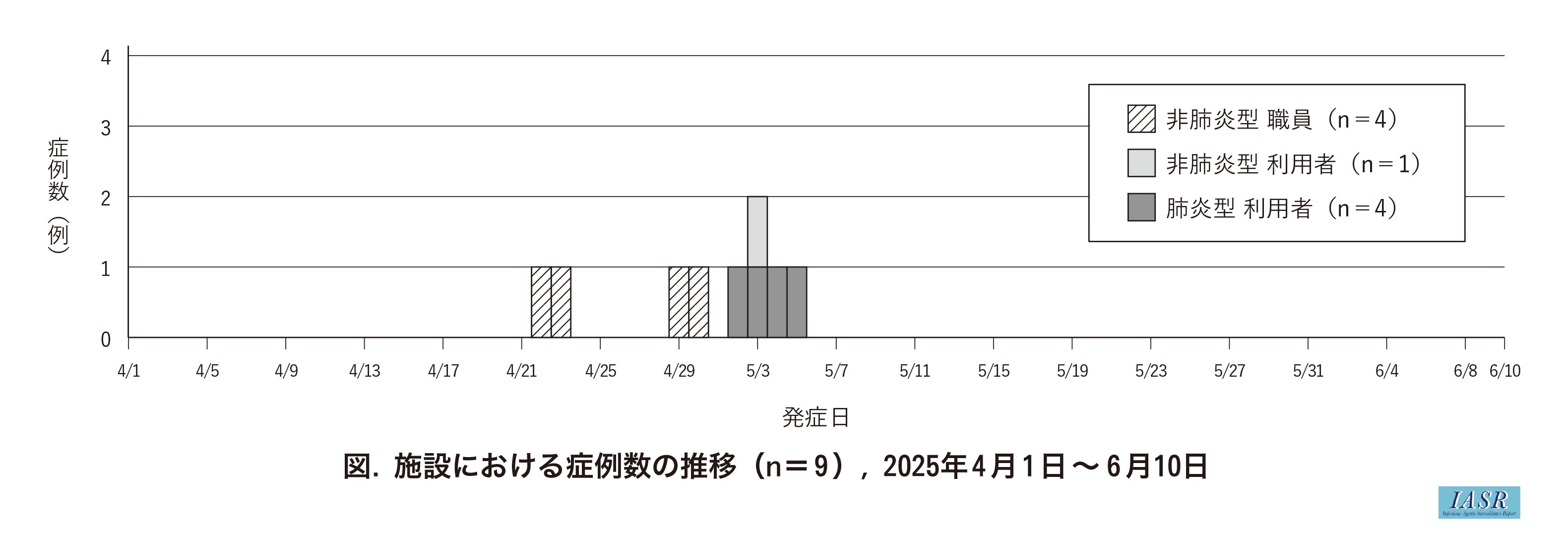 症例は計9名(利用者:5/16, 職員:4/22)であり, うち4名が肺炎型, 5名が非肺炎型であった。肺炎型のうち3名は入院を要した。死亡例(2025年6月10日時点)はなかった。9名から検出された髄膜炎菌はすべて血清群Bであり, multilocus sequence typing(MLST)による遺伝子型別ではST-2057であった。いずれもシプロフロキサシンに耐性または中間耐性を示したが, リファンピシンには感性であった。初発は非肺炎型の職員であり, 症例は2025年4月下旬~5月上旬にかけて発生した(図)。肺炎型は全例が利用者で, 年齢中央値が83歳と高く, 心疾患(2名, 50%), 脳血管疾患(2名, 50%), 認知症(2名, 50%)など基礎疾患を有する者が大部分を占めた。一方, 非肺炎型は, 5名中4名が50~70代の職員であった。聞き取りおよび観察調査の結果, 職員は介助時にマスクを着用して対応していたものの, 一部で徹底できない場面があった。一方, 利用者はマスクを着用せずに会話する機会が多かった。なお, 同時期に髄膜炎菌検査陰性であったものの, 上気道症状を有した職員と利用者が複数確認された。侵襲性髄膜炎菌感染症発生時対応ガイドライン〔第二版〕(以下, IMDガイドライン)1)に準じ, 全職員および利用者への予防投与, 健康観察等の対応が実施された。なお, 当初シプロフロキサシンによる予防投与が行われたが, 耐性と判明したため, 協力医に相談のうえリファンピシンの予防投与が行われた。5月6日以降, 新規症例の発生はなく, 6月10日に事例の終息とした。