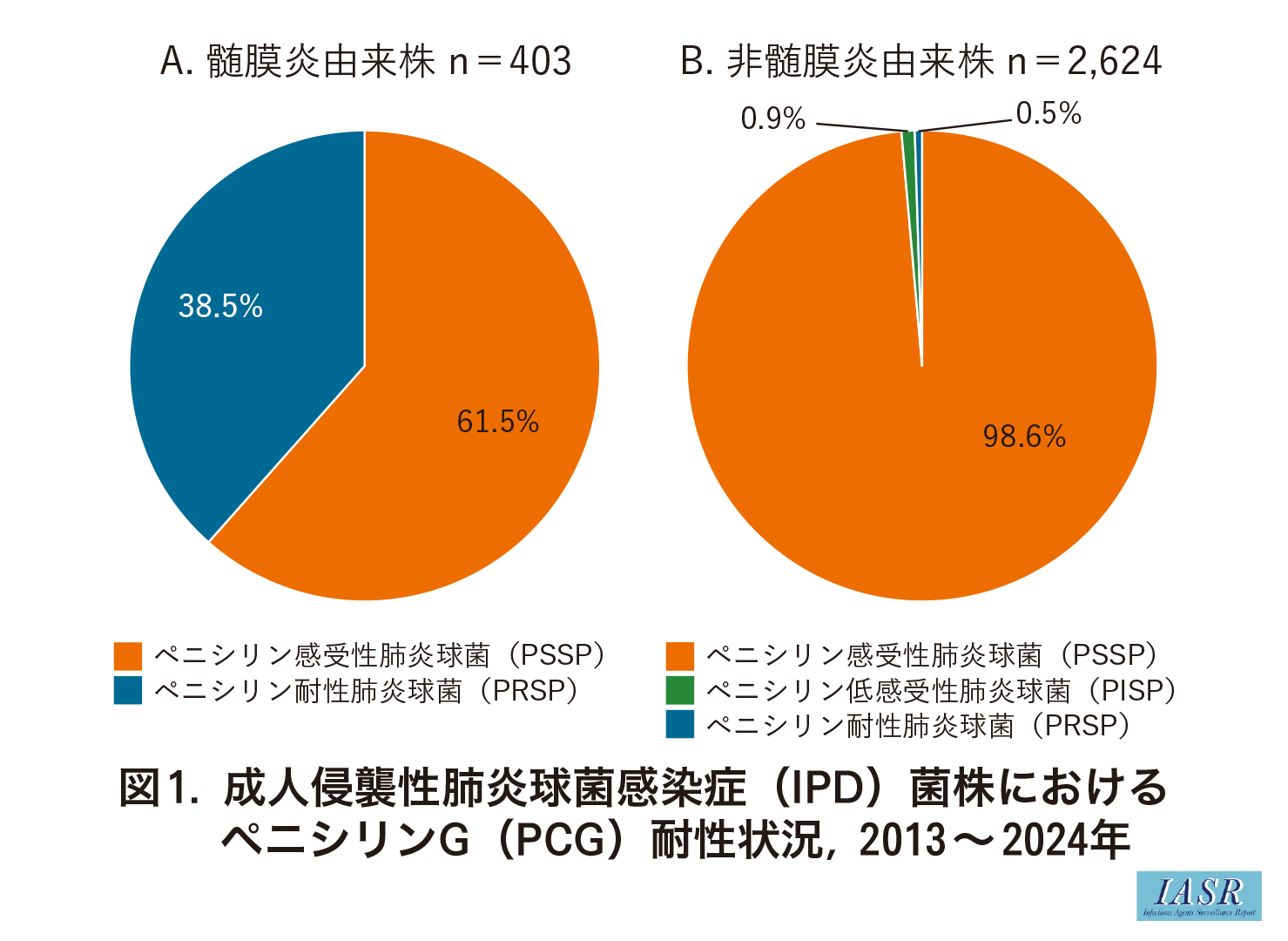 2025年12月時点で, 2013~2024年の間に収集された成人IPD由来株3,027株(髄膜炎403株, 非髄膜炎2,624株)が解析された。髄膜炎由来株(n=403)においては, 155株(38.5%)がペニシリン耐性肺炎球菌(penicillin-resistant Streptococcus pneumoniae: PRSP)と判定された(図1A)。非髄膜炎由来株(n=2,624)においては, ペニシリン低感受性肺炎球菌(penicillin-intermediate S. pneumoniae: PISP)およびPRSPと判定される株はそれぞれ24株(0.9%)と13株(0.5%)にとどまった(図1B)。