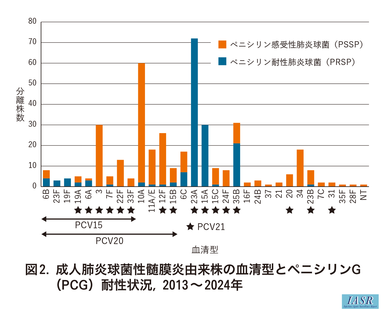 肺炎球菌性髄膜炎の致命率は高く, 薬剤耐性が世界的に課題となっている4)。本研究の成人髄膜炎から分離された株において, 新たに定期接種に導入されるPCV20は, 約50%の血清型カバー率を示していた。ワクチンは肺炎球菌感染症を予防する中で, 薬剤耐性菌の抑制にも寄与することが期待されており, 高齢者における定期接種率の向上が望ましい。今後, 定期接種にPCV21が導入され広く用いられるようになれば, より高い血清型カバー率となり, 薬剤耐性菌対策においても意義が大きい。新規ワクチンの定期接種化にともないserotype replacement(血清型置換)が予想されるため, 成人IPDにおける血清型および病型別の耐性化傾向について継続的に監視・解析するサーベイランスが必要である。