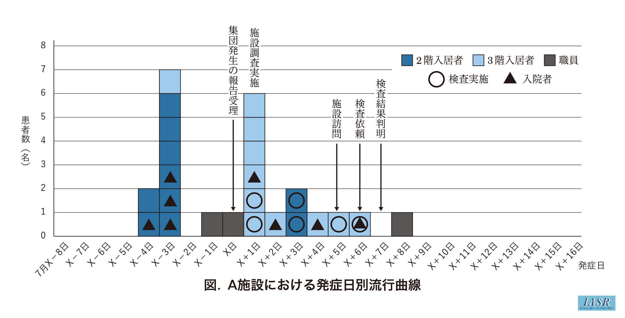 A施設は3階建てであり, 1階は食堂および事務室, 2階と3階に各25名ずつの計50名の高齢者(平均年齢85歳)が入居し, 職員数は42名であった。今回, 7月X日にA施設より発熱と呼吸器症状を呈する患者が10名発生したとの報告を保健所が受け, 翌日, 調査を行った。最初の患者2名が7月X-4日に確認されたため, 症例定義を7月X-4日以降に37.0℃以上の発熱を呈した者, としたところ, 7月X+8日までに入居者21名(年齢62~103歳:中央値88歳), 職員3名の発症がみられた(図)。入居者は特に血中酸素飽和度(SpO2)が低下し, 8名が入院したが, うち2名はRSウイルス感染症以外の疾患による入院であった。