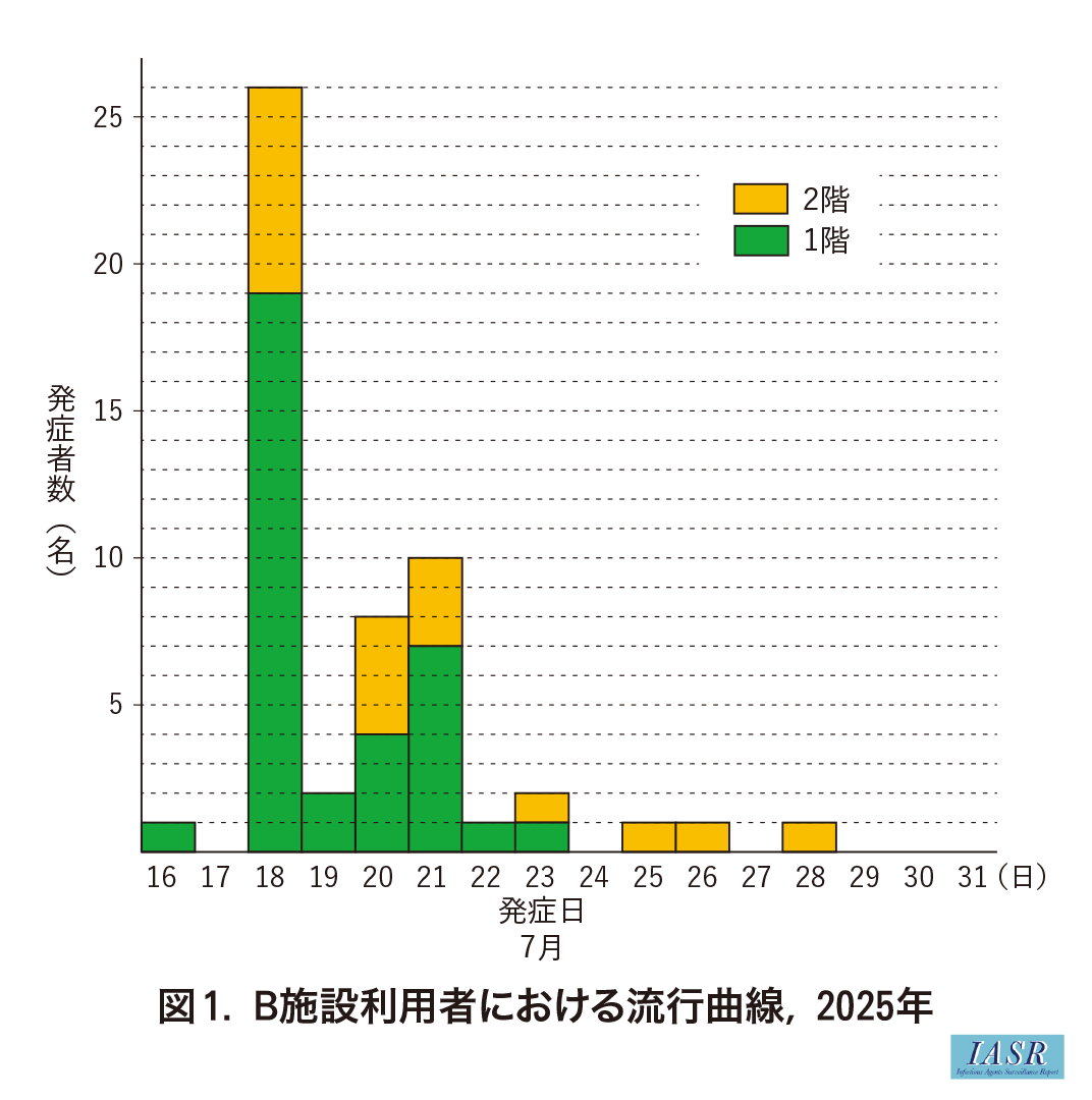 2025年7月, A出張所はB施設から施設利用者64名中46名, 職員は46名中4名が発熱している, との第一報を受けた。重症者がない一方で, 発熱に加えて, 咳嗽や鼻汁を訴える者がおり, 利用者に知的障害があったことから, 多くはマスク着用が困難な状況であった。なお, 発症した複数名に対し新型コロナウイルス(SARS-CoV-2)およびインフルエンザウイルスの抗原検査が実施されたが, 全員陰性であった。