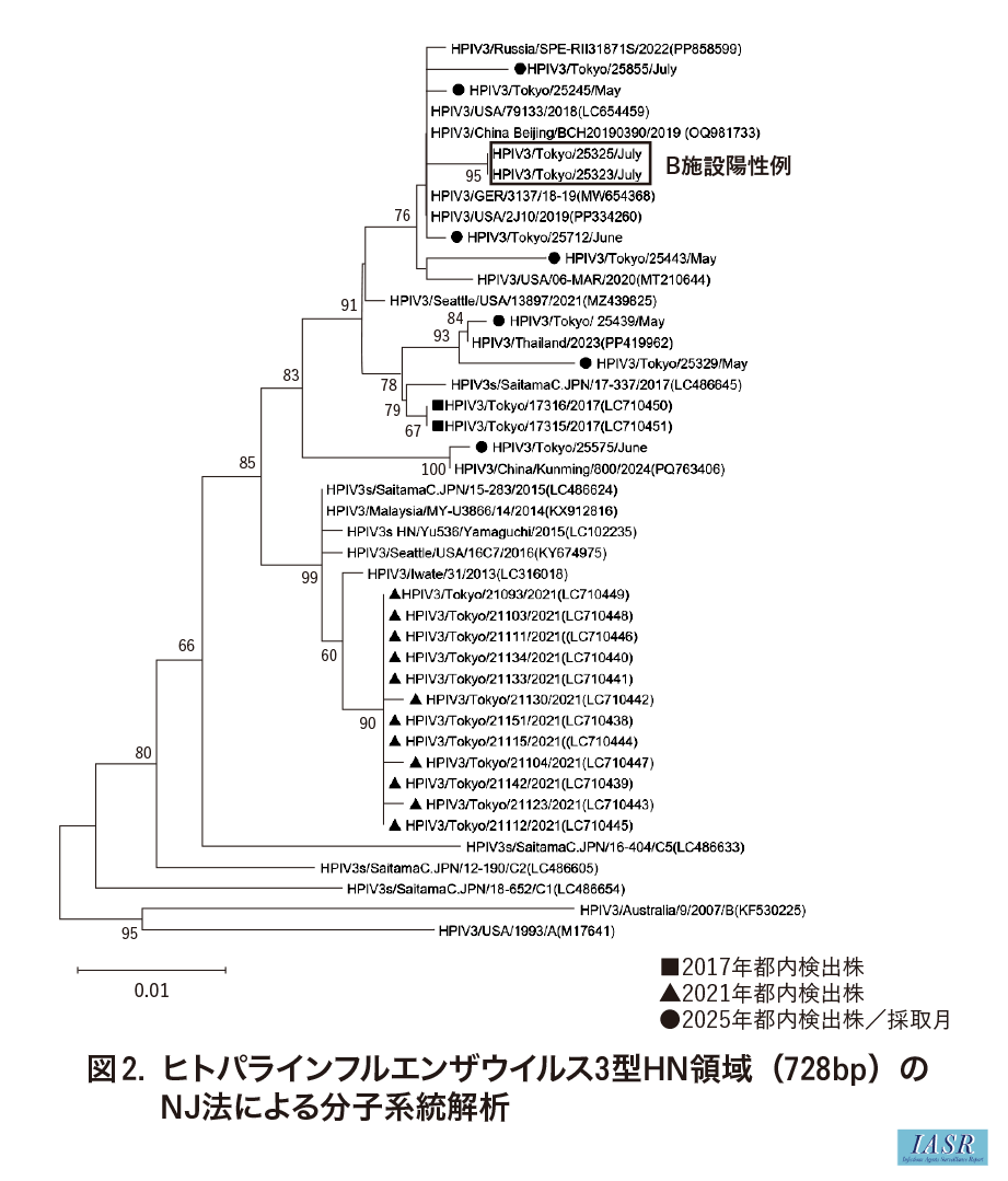 スクリーニング検査により, 供試した全検体からヒトパラインフルエンザウイルス3型が検出されたことから, 分子系統解析により関連性を確認した。咽頭ぬぐい検体から改めてRNAを抽出し, HN領域を対象としたRT-nested PCR検査3)を実施した結果, 2検体から増幅産物が得られた。次いで, 得られた2検体分の試料を用いてダイレクトシーケンス法により塩基配列(728bp)を決定し, 分子系統解析を実施した。その結果, 本事例の配列は同一クレードに帰属するとともに, 2025年に東京都内で実施した感染症発生動向調査において検出された島しょ地域外のヒトパラインフルエンザウイルス3型の近傍に位置することが判明した(図2)。