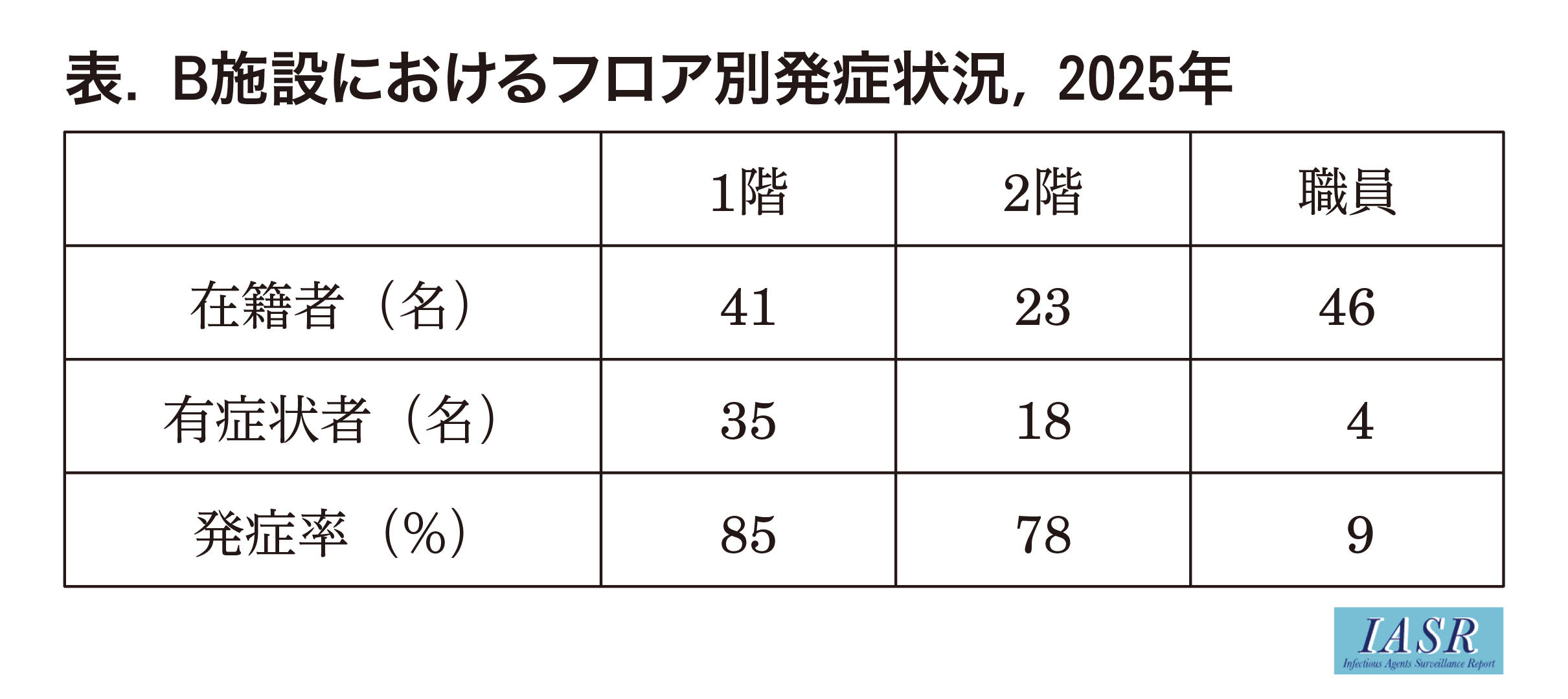 第一報の約1週間後, A出張所はB施設から利用者の有症状者が53名に増加し, 発熱が5日以上長引く者や再発の発熱者もいる, との報告を受けた〔フロア別発症状況(表), 流行曲線(図1)参照〕。