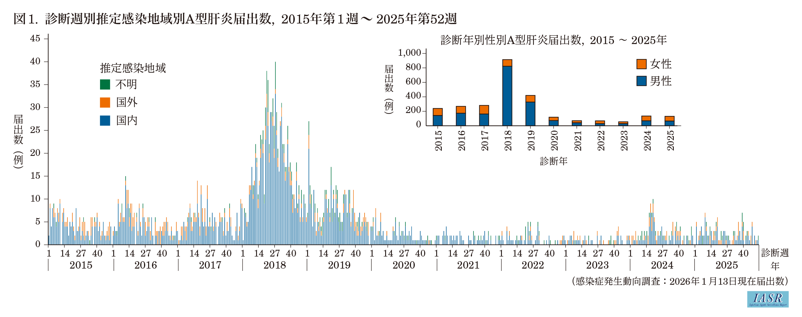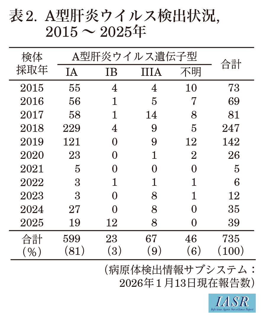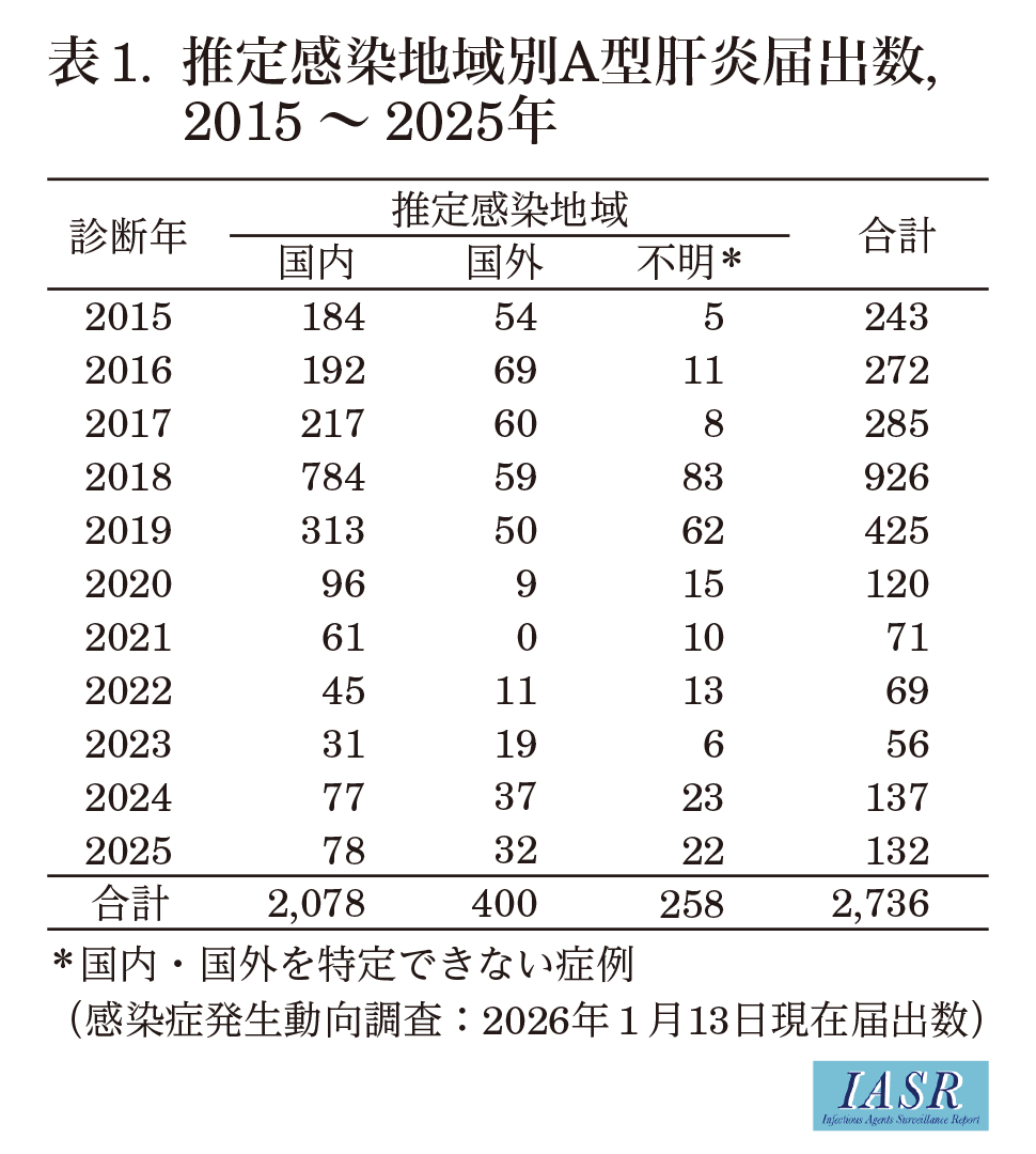 (IASR Vol. 47 p41-42: 2026年3月号)2003年11月の感染症法改正で4類感染症に分類され, 無症状病原体保有者を含む全症例の届出が義務づけられているA型肝炎は, ピコルナウイルス科(Picornaviridae)ヘパトウイルス属(Hepatovirus)のA型肝炎ウイルス(Hepatovirus A1, 通称名はhepatitis A virus:HAV)の感染による急性感染症である。HAVの血清型は1種類であり, 遺伝子型により6つの型(I-VI型)に分類される。ヒトで流行するのは遺伝子型I-III型で, それぞれがAとBのサブグループに分けられる。HAVは汚染された飲食物の摂取や感染者との直接的接触により経口的に伝播する。衛生状態や飲用水管理が不十分な地域で流行がみられる一方, 衛生環境が整備された先進国では, 男性間性交渉者(men who have sex with men: MSM)や薬物静注者(persons who inject drugs: PWID), ホームレス等の集団においてアウトブレイクが発生している(本号7&8ページ)。