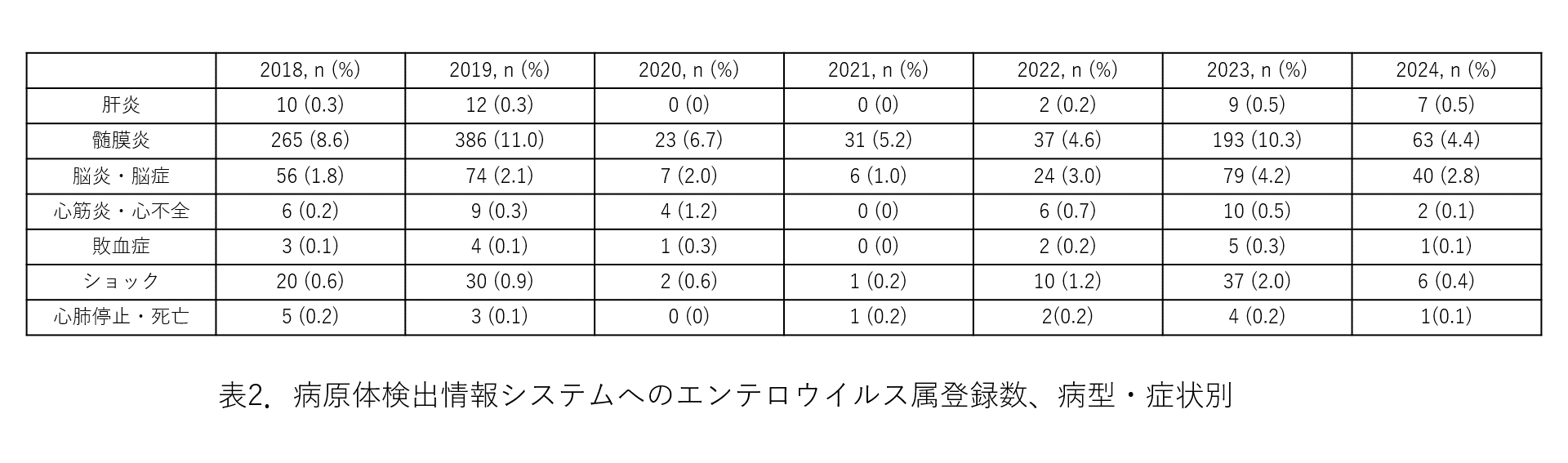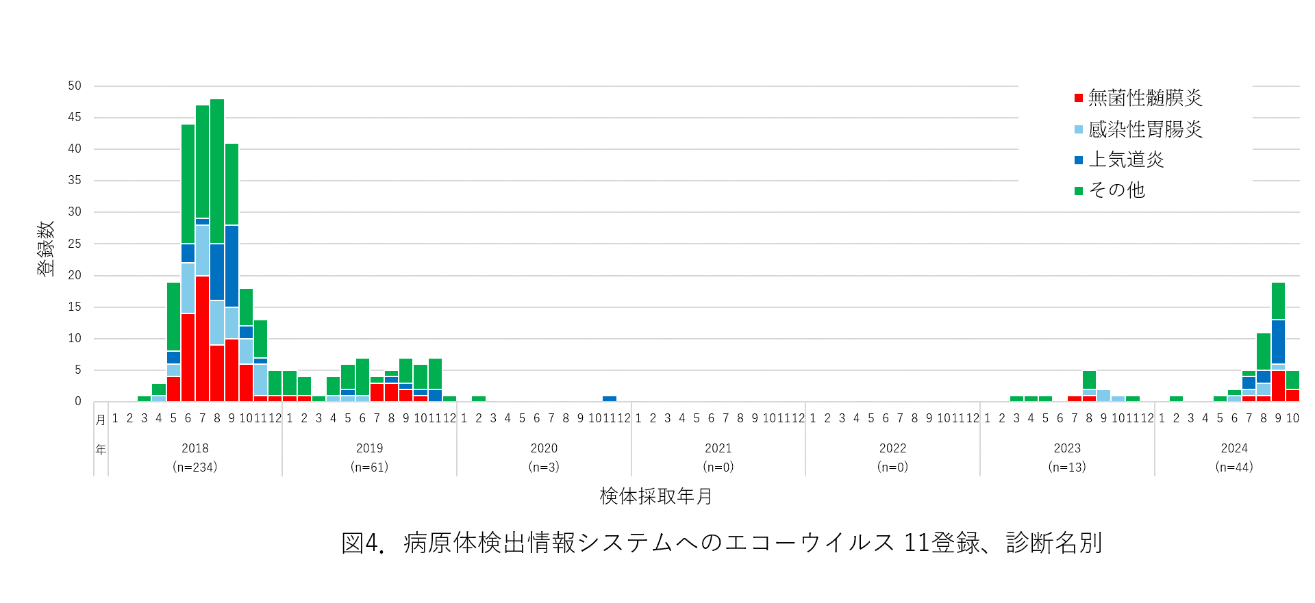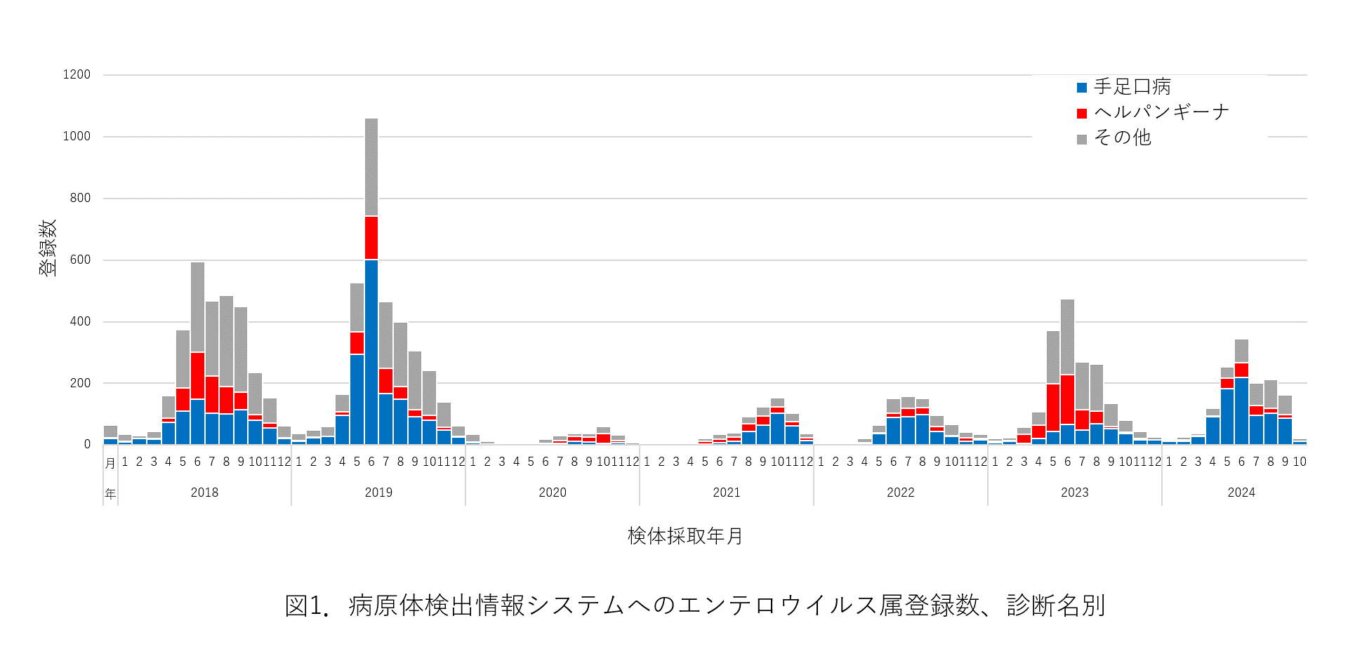2018年1月1日から2024年11月28日までに検体が採取され、病原体検出情報システムに登録されたエンテロウイルス属について集計した(2024年11月28日時点)。最も登録が多かったのは2019年で3513件であり、次いで2018年(3094件)、2023年(1879件)であった。COVID-19パンデミックの間は減少した(2020年:343件、2021年:596件、2022年:810件)。2024年は1418例が登録されている。