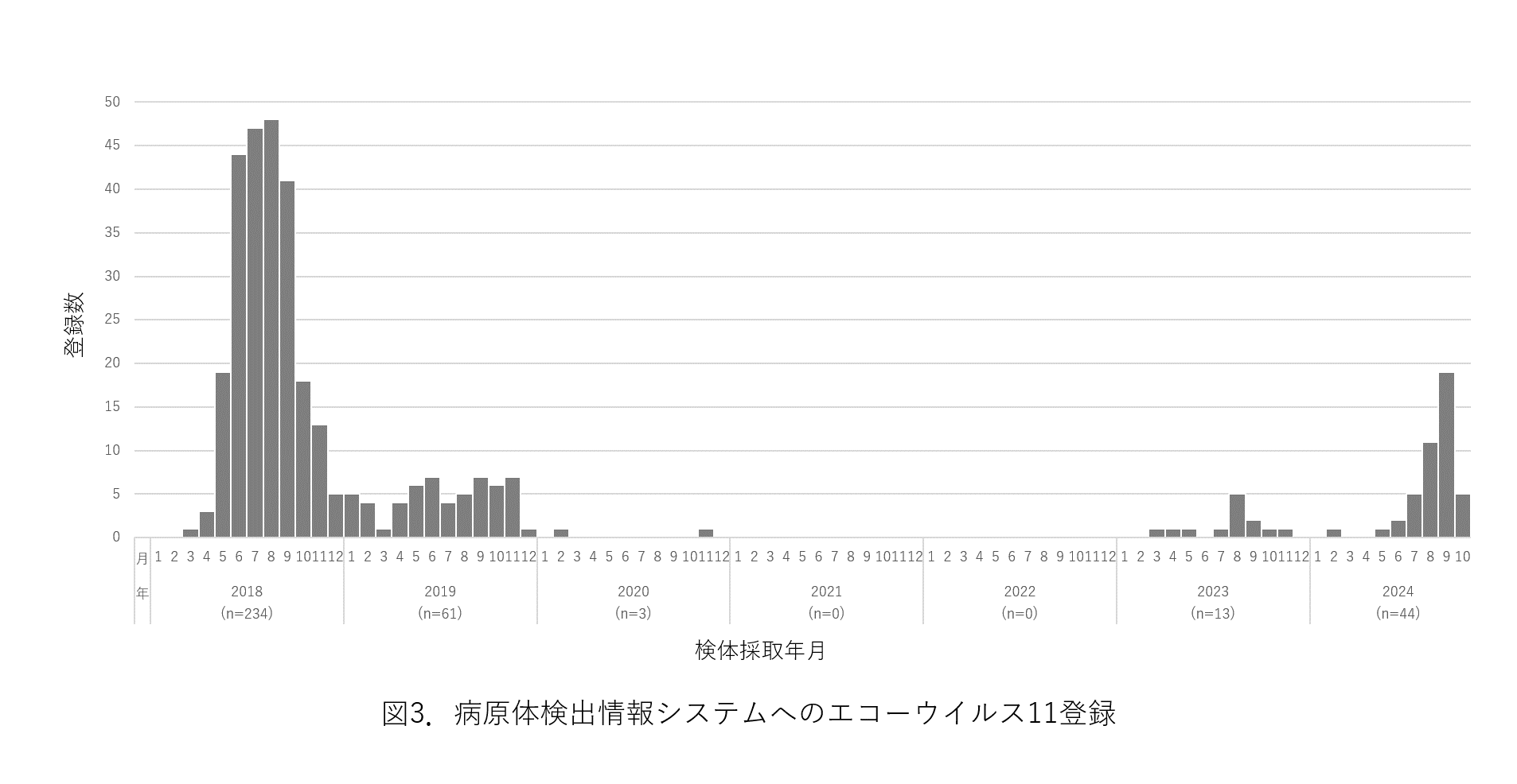 2018-2024年までのE11の登録数は354件であった(図3)。検体採取月別にみるとエンテロウイルス属でみられたような流行パターンは明瞭ではない。2024年のE11登録数は、2018, 2019年に次いで多く、2024には44件が登録されており、5月以降増加傾向にある(注:2024年10月の登録数は追加登録により増加する可能性があるため、解釈に注意が必要である)。