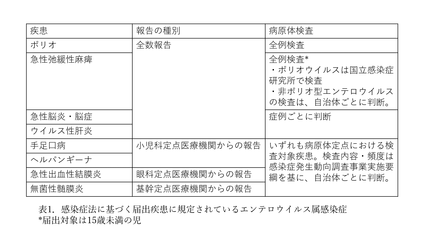 感染症の予防及び感染症の患者に対する医療に関する法律(感染症法)に基づき、届出が規定されている疾患のうちエンテロウイルス属が起因ウイルスとされているものは表1の通りである。地方衛生研究所等において、これらの感染症に対して実施された病原体検査結果は、病原体検出情報システムに登録される。