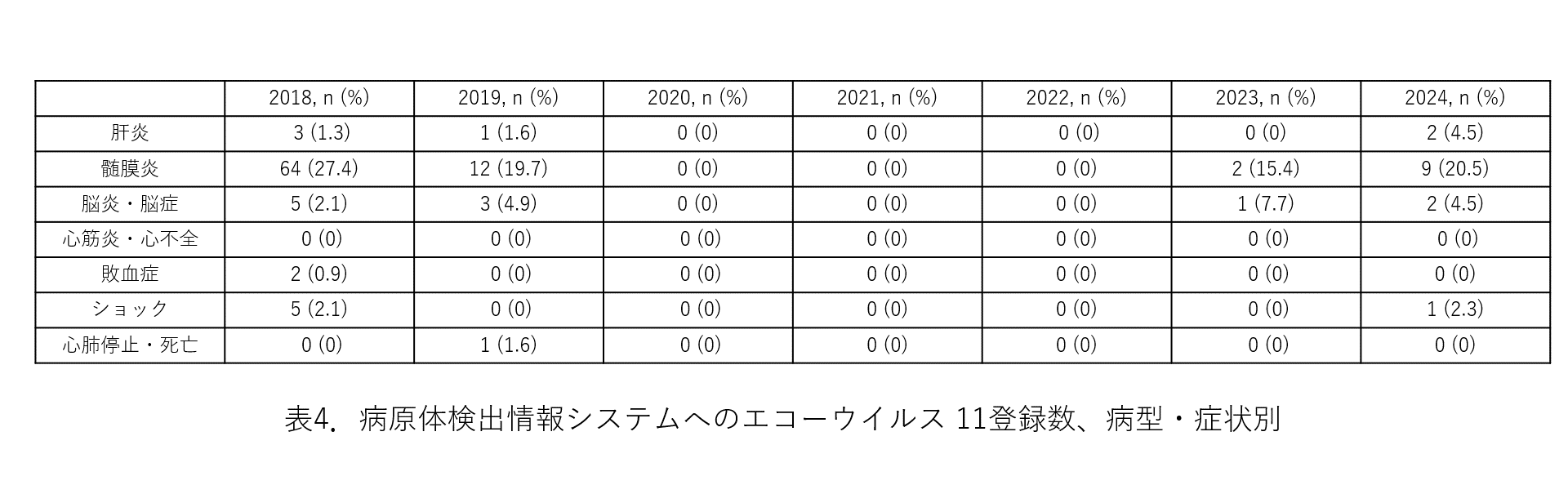 E11における診断名の上位3つは無菌性髄膜炎、感染性胃腸炎、上気道炎であった(図4)。診断名のうち重篤と考えられるものを抽出すると髄膜炎や脳炎・脳症が多い(表4)。肝炎は、2024年に2件が登録されている。