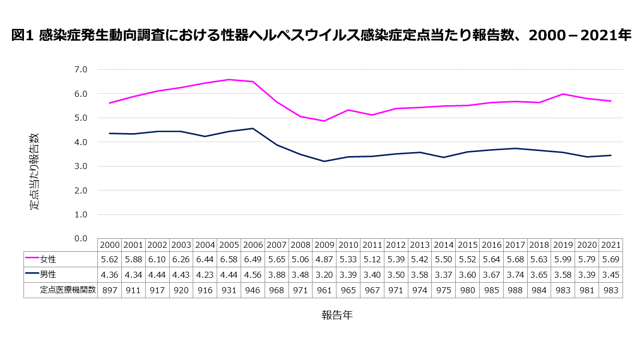 性器ヘルペスウイルス感染症は、単純ヘルペスウイルスの感染によって性器やその周辺に水疱や潰瘍等の病変が形成される疾患である。性器ヘルペスウイルス感染症は感染症法の5類定点把握対象疾患で、地方自治体が定めた性感染症定点医療機関から感染症発生動向調査に報告されている。性感染症定点医療機関数は2007年以降1000弱でほぼ横ばいである。性感染症定点医療機関では医師が「症状や所見から性器ヘルペスウイルス感染症を疑い、かつ、届出のために必要な臨床症状(性器や臀部にヘルペス特有な有痛性の1から多数の小さい水疱性又は浅い潰瘍性病変)により、性器ヘルペスウイルス感染症患者と診断した」症例を月毎に集計し、性器ヘルペスウイルス感染症として報告している。