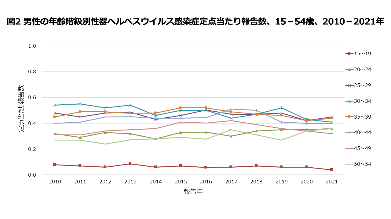 5歳毎の年齢階級別定点当たり報告数は、男性では2021年は20代後半から40代前半が多かった。定点当たり報告数としては多くないものの、2015年以降20代前半で、2018年以降50代前半で増加傾向であった(図2)。