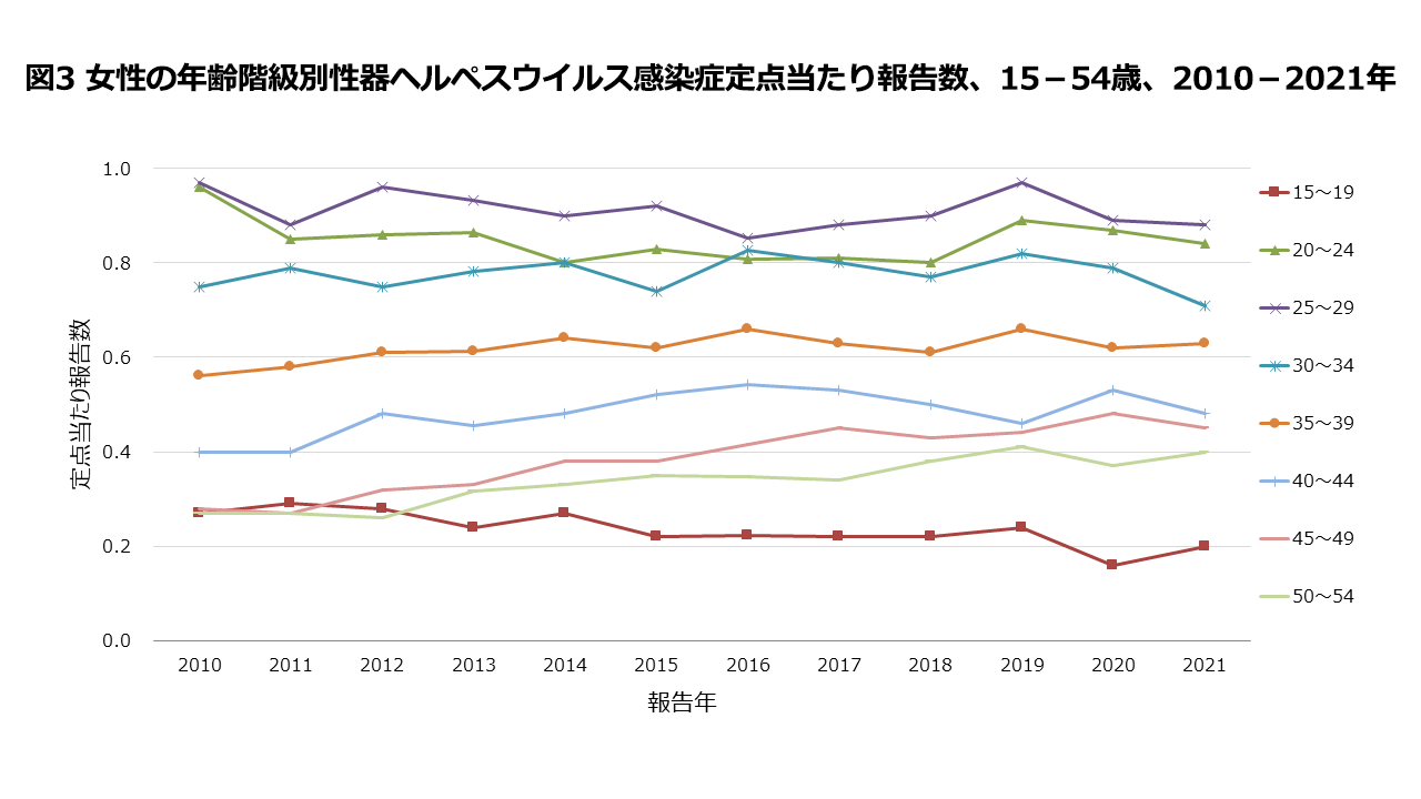女性の年齢階級別定点当たり報告数は、2012年以降継続して20代後半が最も多かった。また、定点当たり報告数としては多くないものの、40代から50代前半は増加傾向であった(図3)。