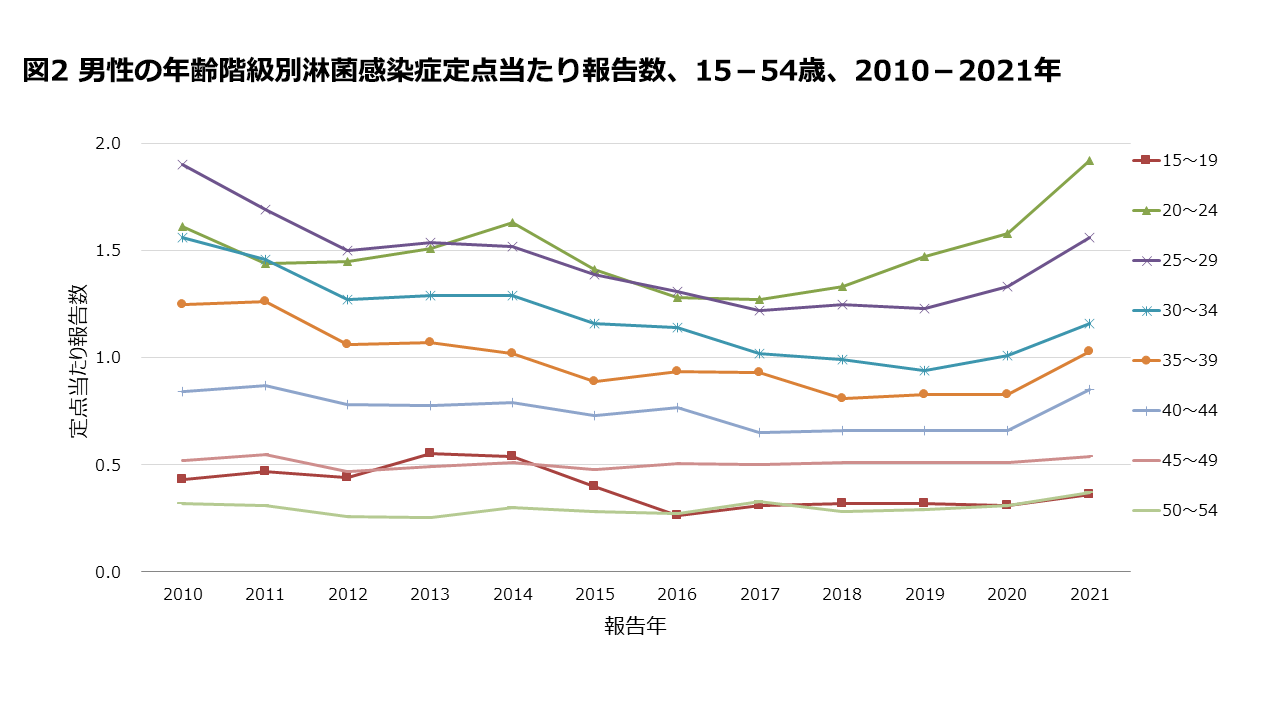 5歳毎の年齢階級別定点当たり報告数は、男性では2017年以降20代前半が最も多かった(図2)。また、多くの年齢階級で2011年以降横ばいから減少傾向であったが、2018年から20代で、2020年から25-34歳で増加を認め始め、2021年には全ての年齢階級で増加に転じた。