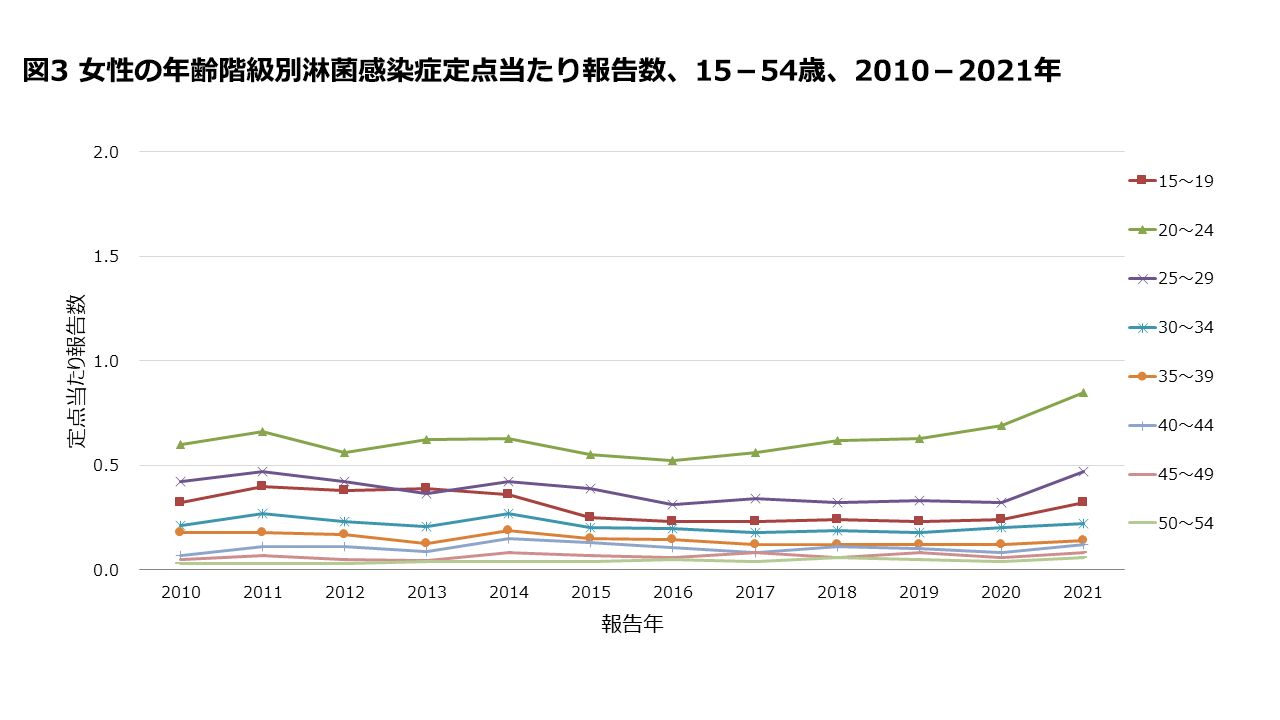 女性の年齢階級別定点当たり報告数は2010年以降、20代前半が最も多かった(図3)。また、多くの年齢階級で横ばいから減少傾向であったが、2017年から20代前半で、2021年から全ての年齢階級で増加してきていた。
