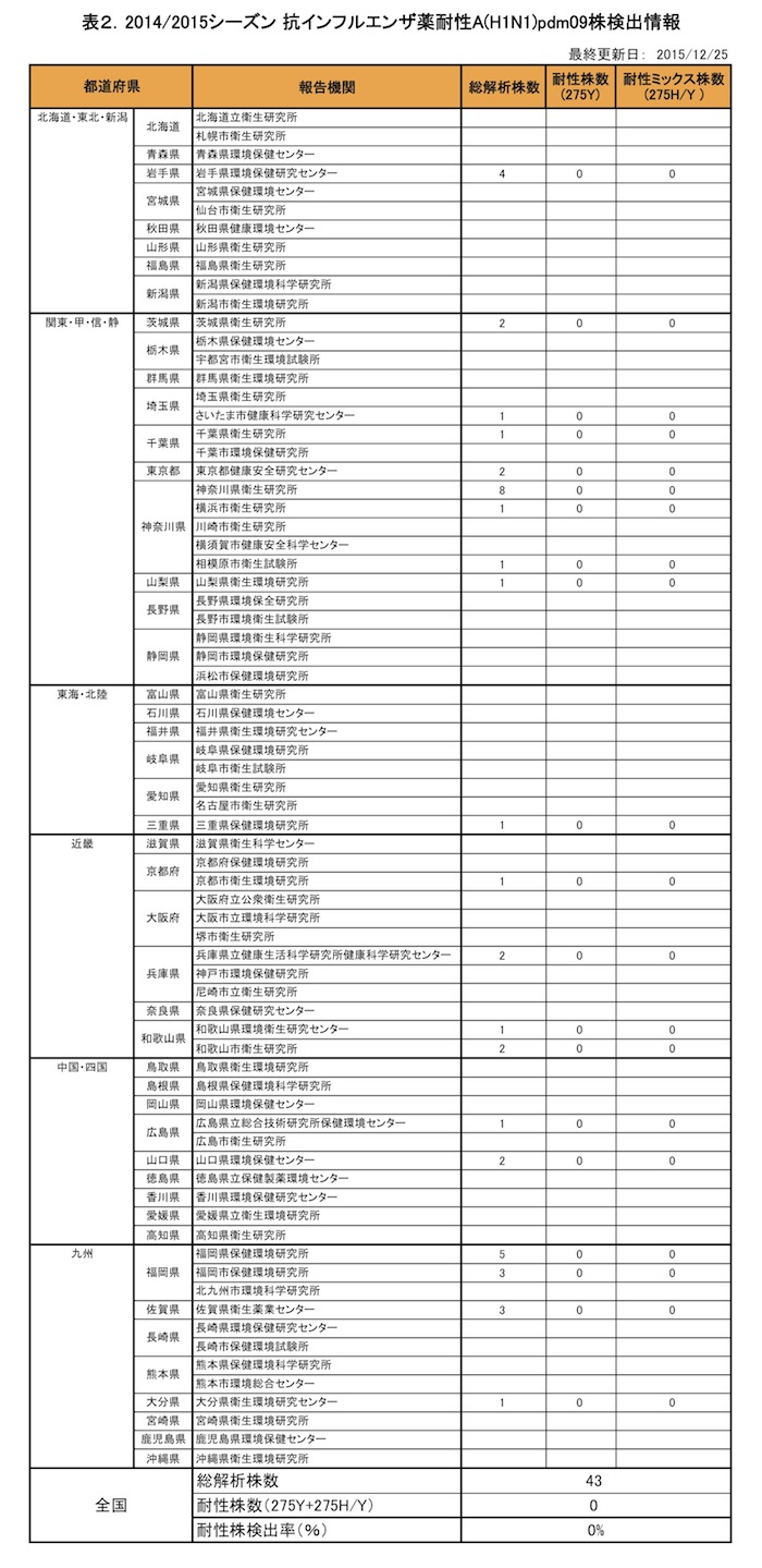 - 表2.抗インフルエンザ薬耐性A(H1N1)pdm09株検出情報 報告機関別
