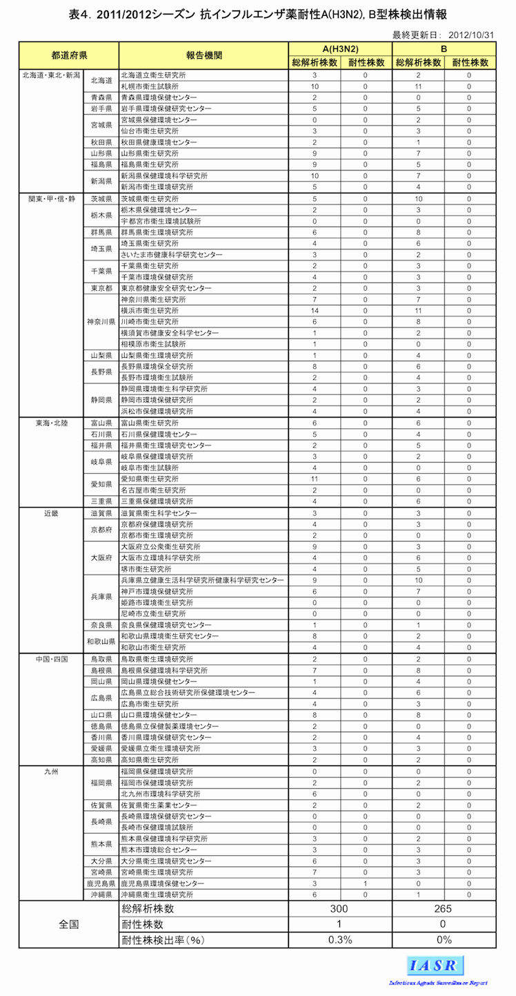 - 表4.抗インフルエンザ薬耐性A(H3N2), B型株検出情報 報告機関別(PDF:51.43 KB)