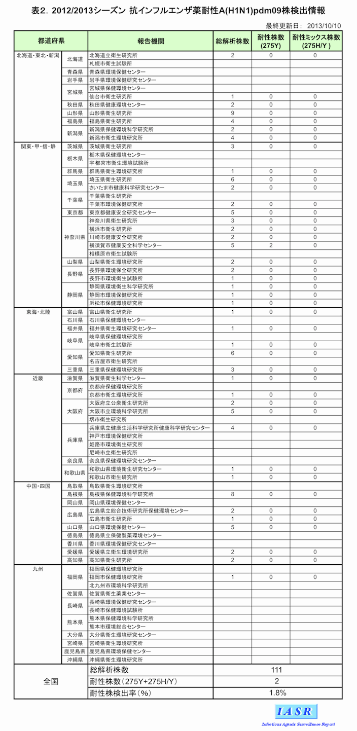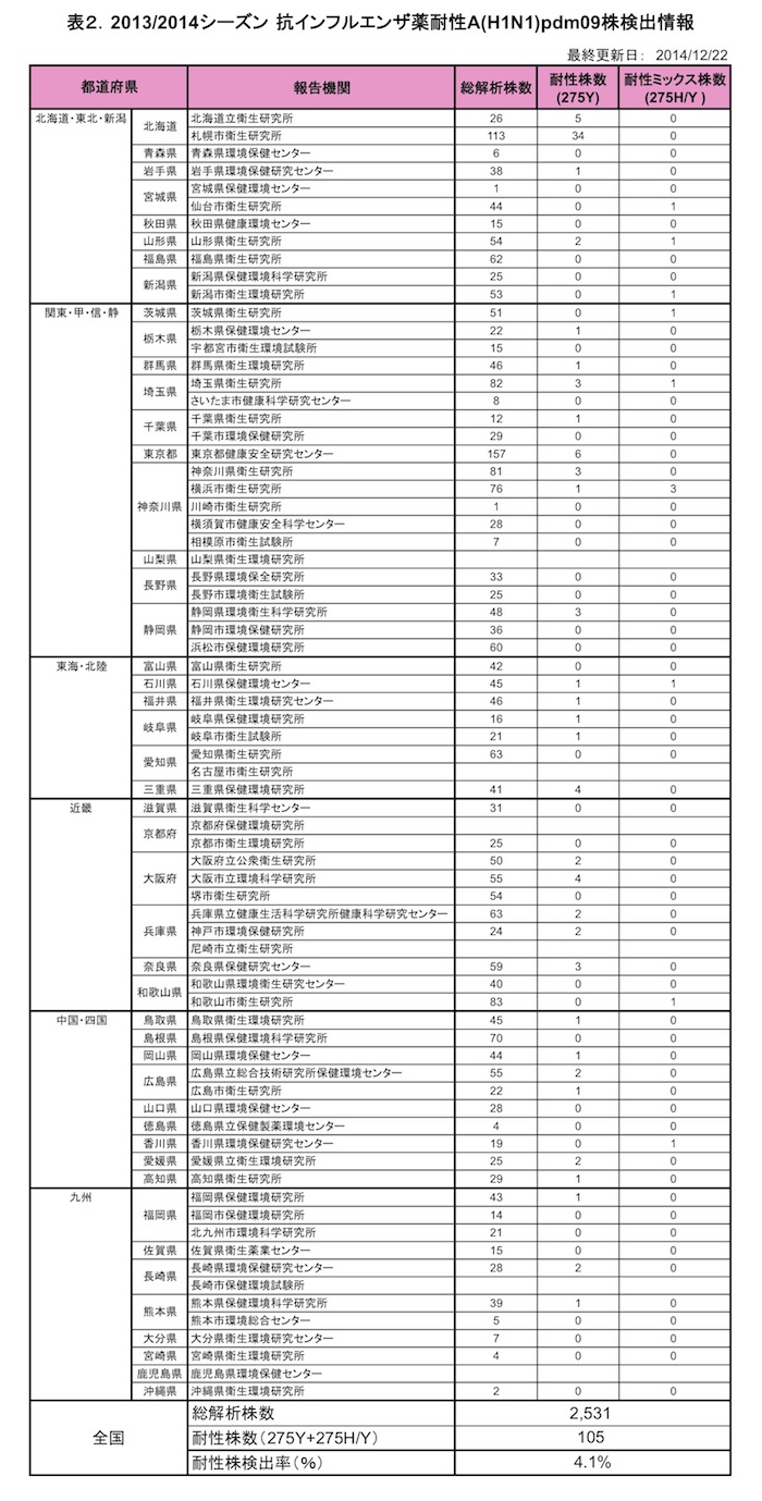 - 表2.抗インフルエンザ薬耐性A(H1N1)pdm09株検出情報 報告機関別