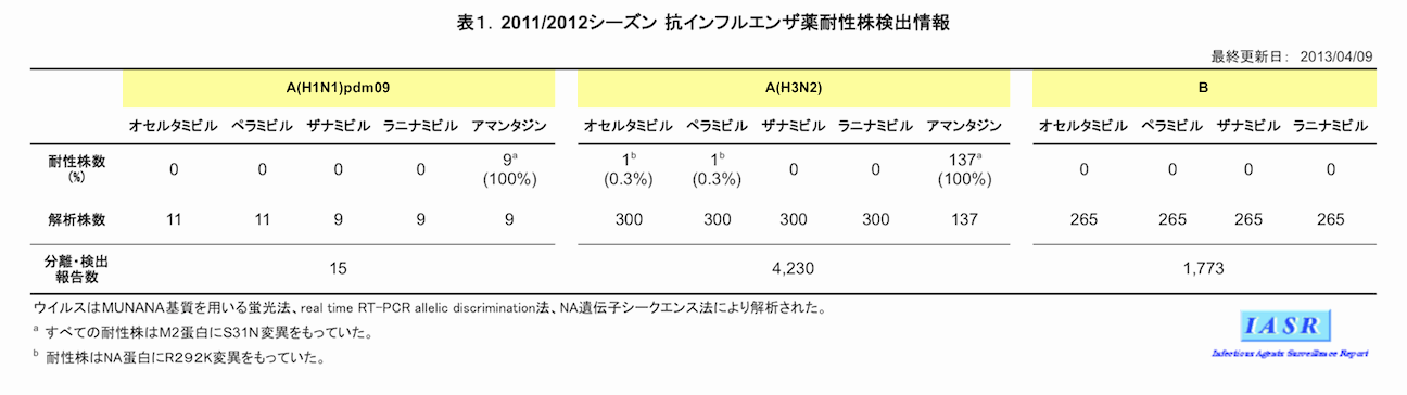 - 表1.抗インフルエンザ薬耐性株検出情報 [A(H1N1)pdm09, A(H3N2), B]