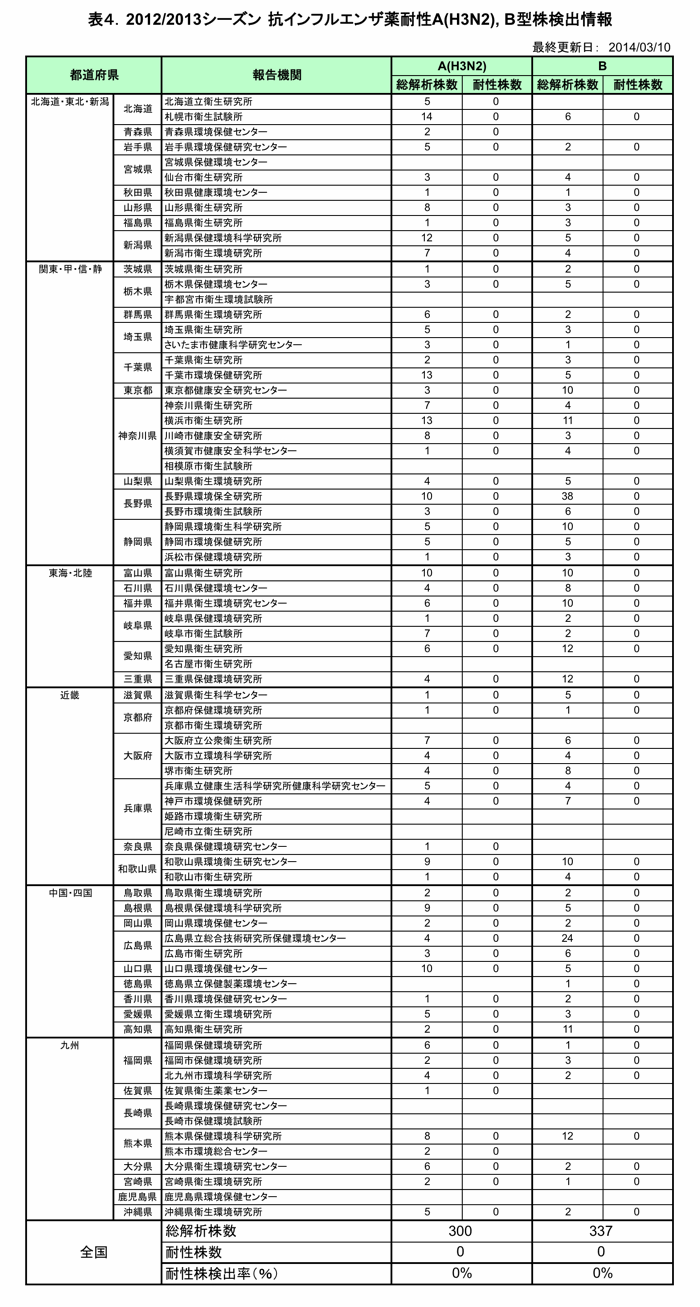 - 表4.抗インフルエンザ薬耐性A(H3N2), B型株検出情報 報告機関別(PDF:51.43 KB)