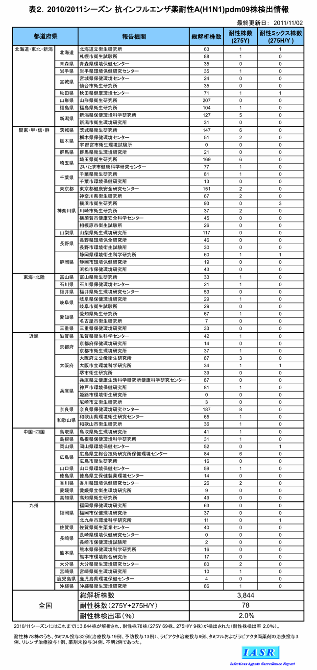 - 表2.抗インフルエンザ薬耐性A(H1N1)pdm09株検出情報 報告機関別