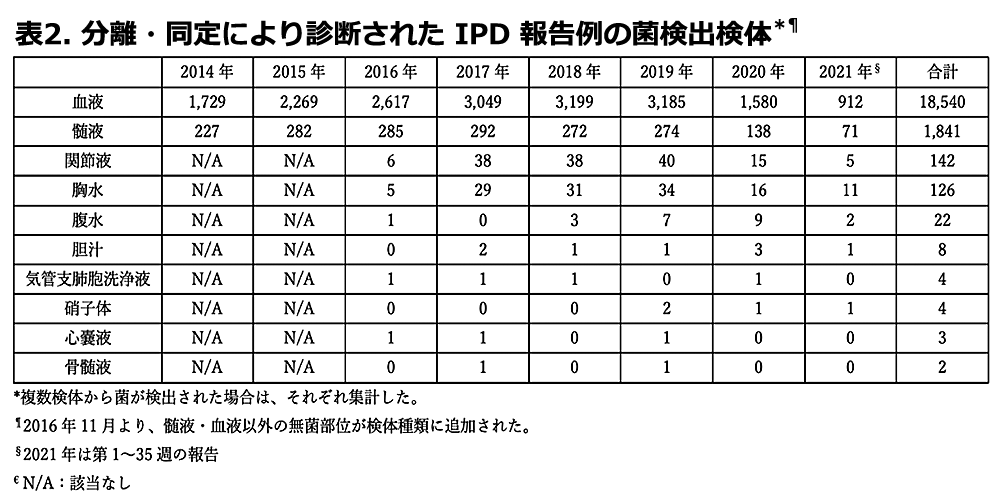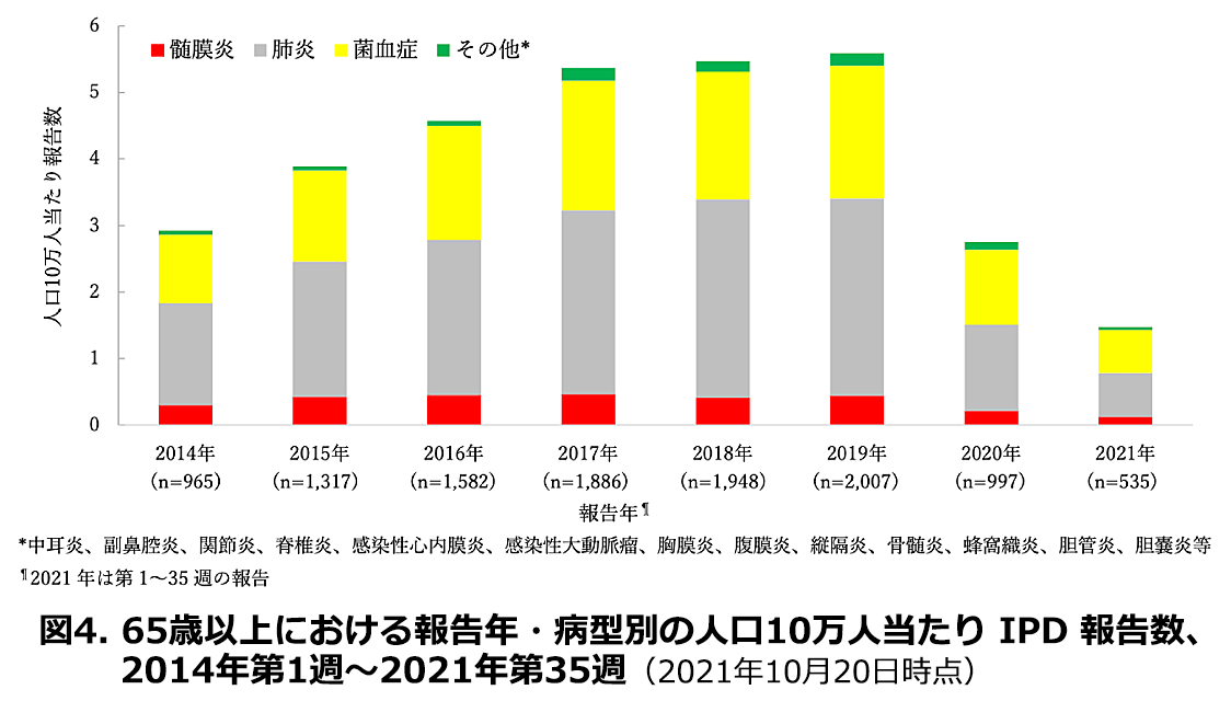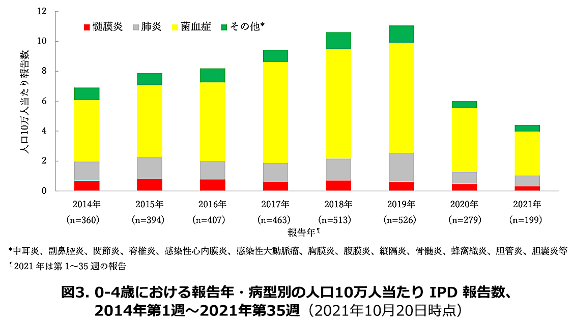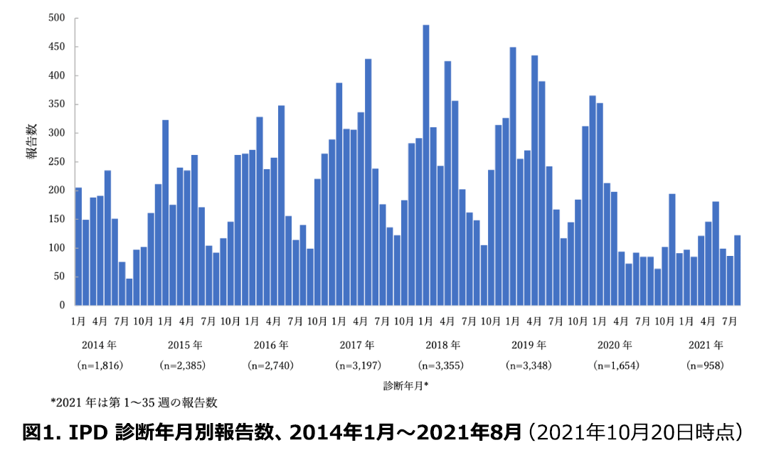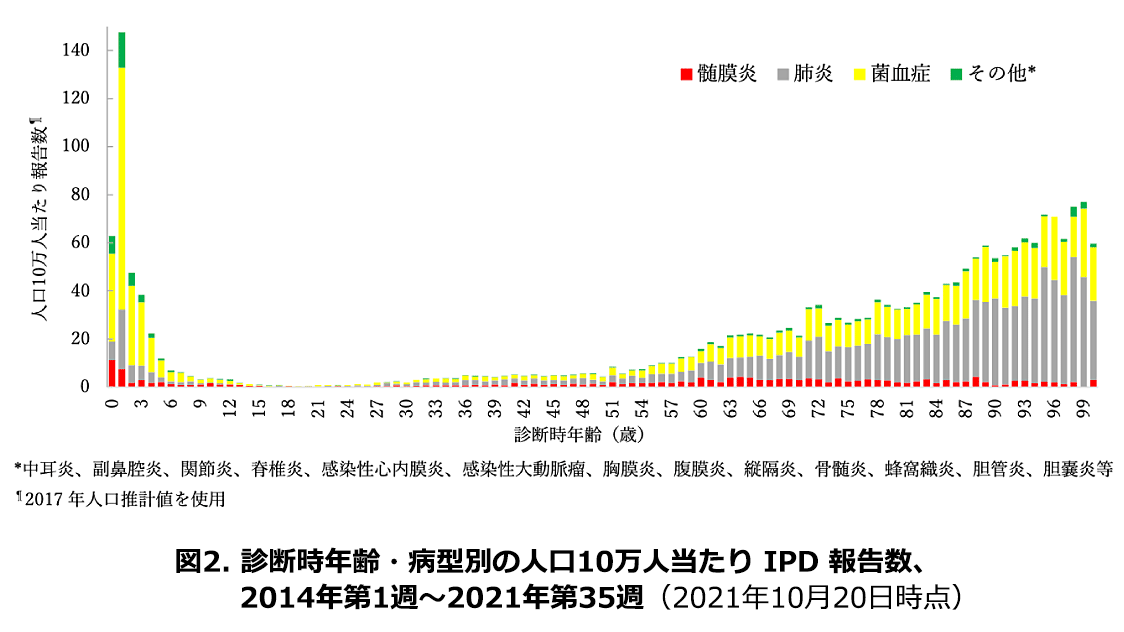 2014年第1週から2021年第35週に感染症発生動向調査に報告されたIPD症例を集計した(2021年10月20日時点)。人口情報は、各年の総務省統計局人口推計を使用した3。IPDの病型は髄膜炎、肺炎、菌血症、その他と分類し、届出票の症状欄に記載された内容を集計した。ただし、本まとめにおける「菌血症」は「明らかな感染巣を認めない菌血症」とし、症状欄に「菌血症」と記載されたもののうち、診断に用いた検体として血液・髄液以外の無菌部位(関節液、胸水等)が記載された症例は「その他」と分類した。