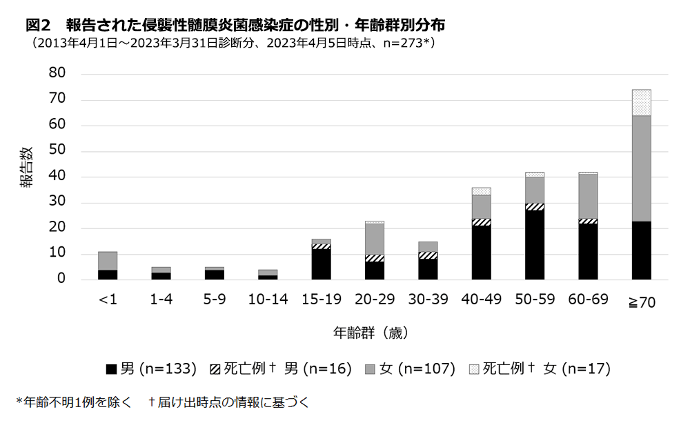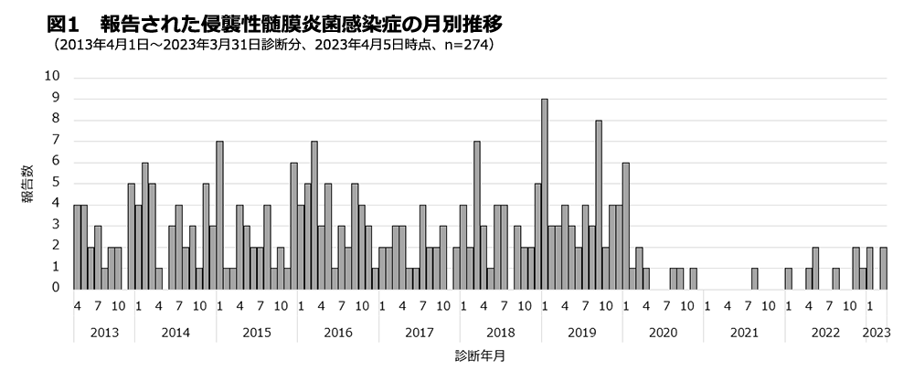 2013年4月1日から2023年3月31日までに診断され、IMDとしてNESIDシステムに報告があった274例(2023年4月5日時点)について記述した。届出票の症状欄に示されている「髄膜炎」または髄膜炎を疑う症状(「頭痛」、「嘔吐」、「意識障害」、「項部硬直」、「大泉門隆起」のいずれか)が記載された症例は髄膜炎として分類した。血清群についてはNESIDシステムに登録された情報と、国立感染症研究所細菌第一部で判定された結果を含めて集計した。