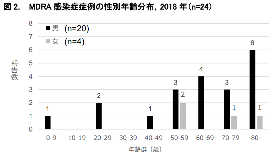 全数把握となって以降、MDRA感染症の報告数は減少傾向であり、2018年の報告では性別、年齢、診断名、分離検体、分離菌種の分布に大きな変化は認められなかった。