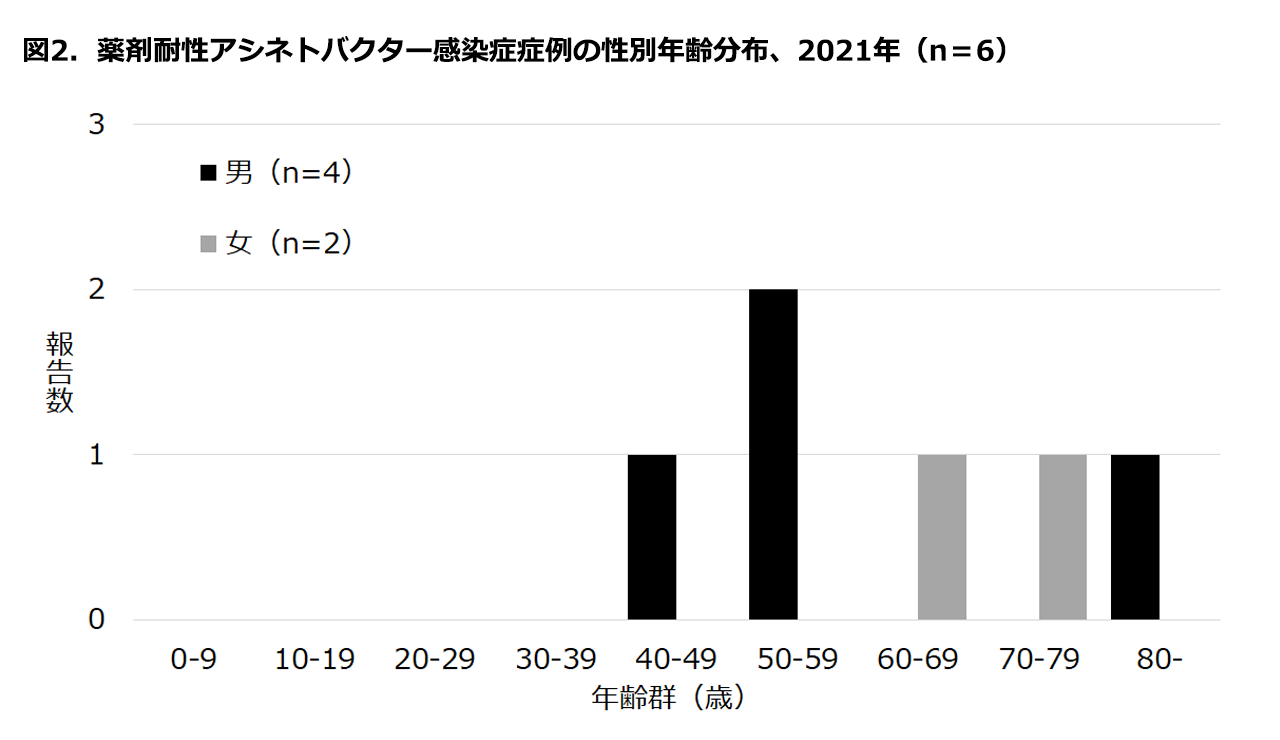 2023年2月3日現在、2021年疫学週第1週~第52週(2021年1月4日~2022年1月2日)に薬剤耐性アシネトバクター感染症と診断され、報告された症例は6例であった(図1)。2016年以降、報告数は減少傾向であり、2021年も減少が続いた。届出時までに死亡した症例はなかった。性別は男性が4例(67%)、診断時年齢の中央値は59.5歳(範囲48-83歳)であった(図2)。70歳以上の症例数は、2016年から2019年は50%前後で推移していたが、2020年は2例(20%)および2021年は2例(33%)に減少していた。2021年の届出時点の診断名(注意:)は、菌血症・敗血症が3例(50%)と最も多く(表1)、菌が分離された検体では血液が3例(50%)と最も多かった(表2)。報告は、茨城県、東京都、愛知県、滋賀県、鳥取県、福岡県から各1例ずつ(17%)あり、滋賀県からの報告は全数把握開始以降初めてのものであった。全数把握開始以降、33都道府県から報告があり、東京都(30例)、埼玉県(27例)、神奈川県(14例)、千葉県(14例)の順に多く報告されていた。感染地域が国外であった症例の割合は、2015年から2019年は11~21%で、2020年は30%(3/10)に増加したが、2021年は感染地域が国外の症例はなかった。