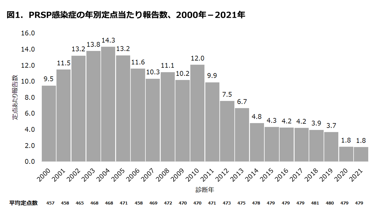 ペニシリン耐性肺炎球菌(Penicillin-resistant Streptococcus pneumoniae: PRSP)感染症は、1999年4月に施行された感染症法で四類定点把握対象疾患に、また、2003年11月の感染症法の改正では五類定点把握対象疾患となり、現在、基幹定点医療機関(病床数300以上の内科又は外科を標榜する病院で、全国約500定点)の医師がPRSP感染症と診断した場合、月単位で届出ることが義務づけられている。