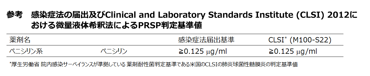 PRSP感染症としての届出対象はPRSPにより発症した患者であり、保菌しているだけの者は対象外である(届出基準、届出票についてはhttps://www.mhlw.go.jp/bunya/kenkou/kekkaku-kansenshou11/01-05-37-01.html (外部サイトにリンクします)参照)。なお、感染症法に基づく届出の基準として示されたPRSPの判定基準値は病院で用いられている判定基準値と異なることがある(文末参考)。