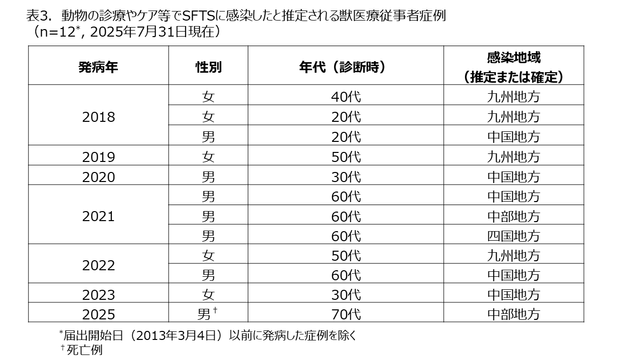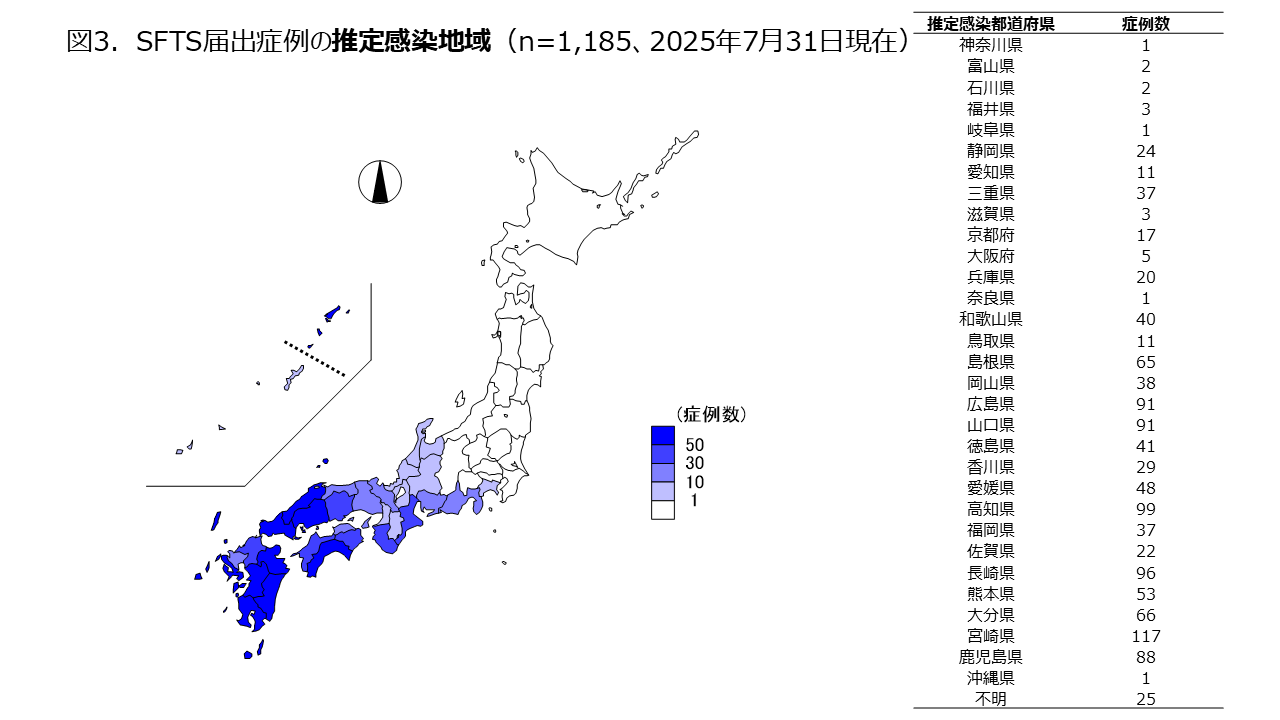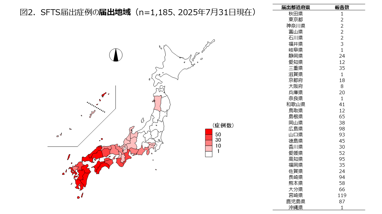 2013年3月4日、SFTSは感染症法における4類感染症、全数把握対象疾患に定められた。これまで(2025年7月31日現在)に1,185症例が感染症発生動向調査に届出されている。男女比は1:1で、届出時点の年齢中央値は75歳だった。 前回集計分(2025年4月30日)からの報告数(遅れ報告を含む)の増加は114例であった。