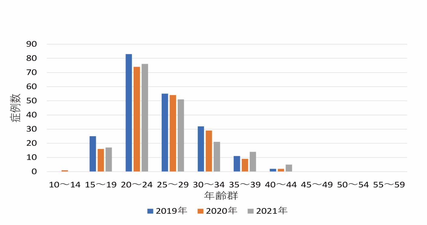 妊娠症例、CSW症例のいずれも3年間を通じて20~24歳の年齢群が多かった。妊婦症例の40%(233/577例)、CSW症例の39%(947/2,411例)を20~24歳が占めた。妊娠症例は、10~44歳の年齢群で認められ、15~39歳は98%(567/577例)を占めた(図1)。2019年と2021年で妊娠症例の年齢分布に大きな変化はなかったが、35~44歳以外の各年齢群において、2021年の報告数が2019年を下回っていた。一方、CSW症例は3年間を通じてより幅広い年齢群で認められた(図2)。2019年と2021年でCSW症例の年齢分布に大きな変化はなく、2021年にはほとんどの年齢群で報告数が増加した。また、20~29歳の年齢群が占める割合は、2019年の61%(450/740例)から2021年の67%(675/1,010例)に増加した。