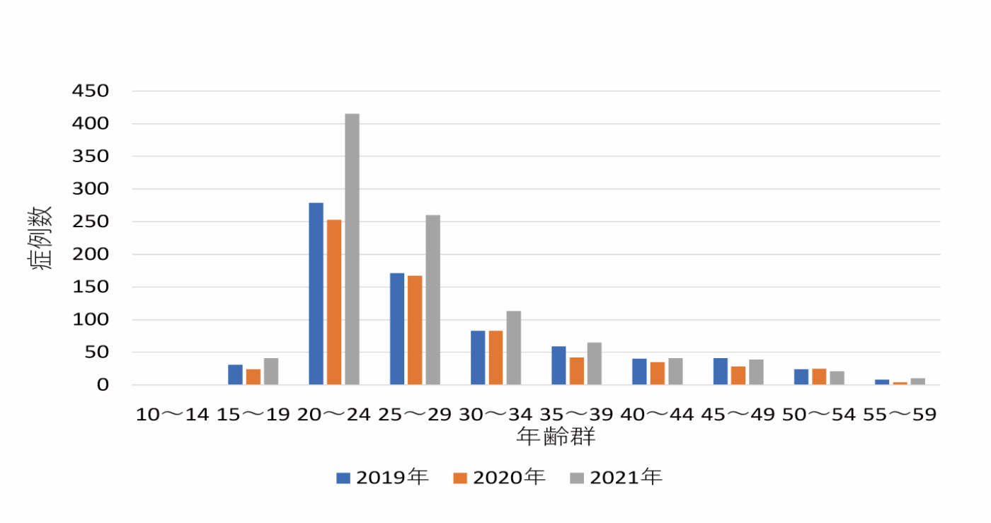 図2.CSW症例の年齢分布(10~59歳)、2019~2021年