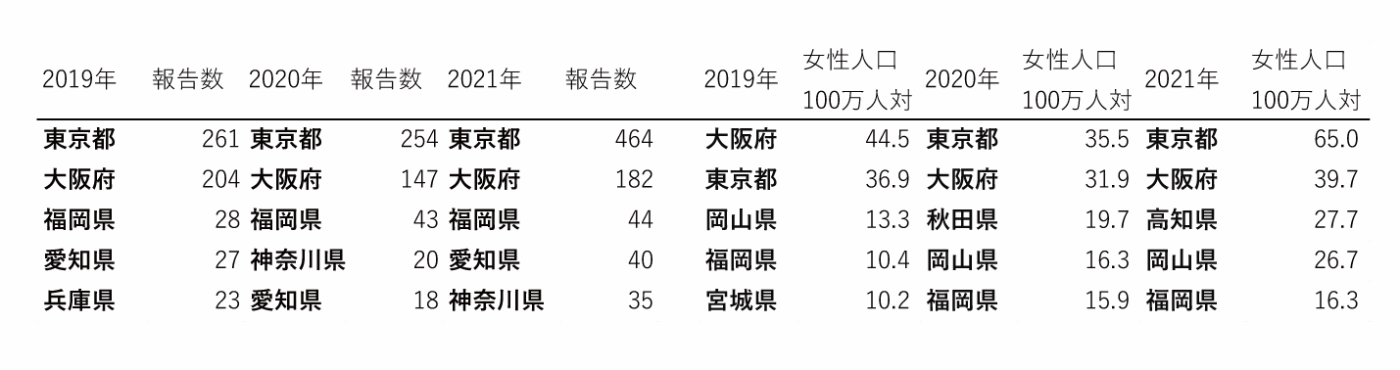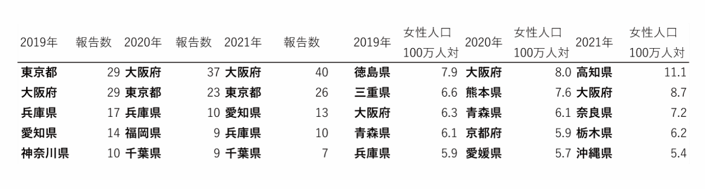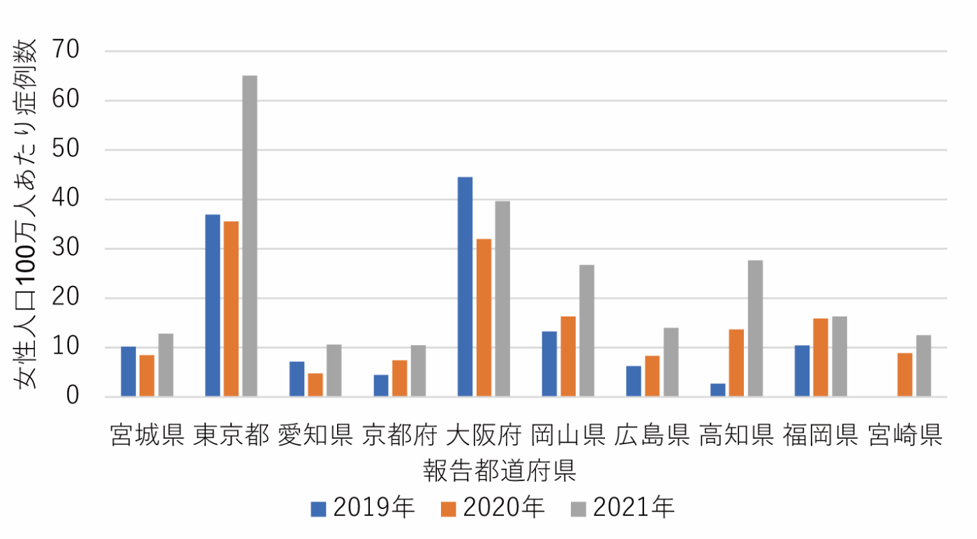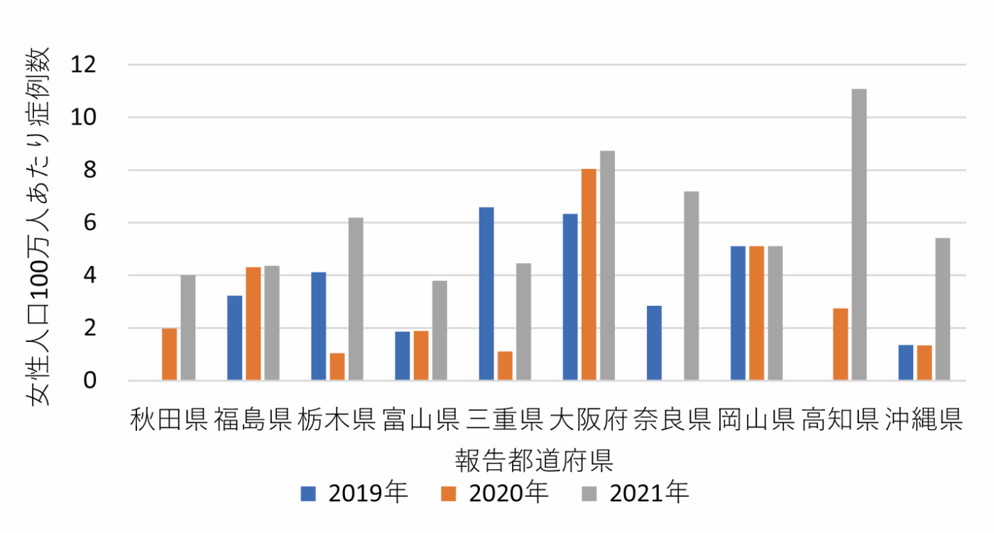 「女性人口10万人あたり」症例数を「女性人口100万人あたり」症例数へ訂正しました。また、表2における2021年女性人口対妊娠症例数を一部(高知県、奈良県)修正しました。(2023年2月9日)。